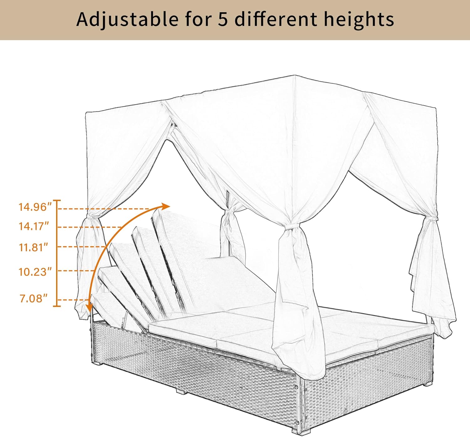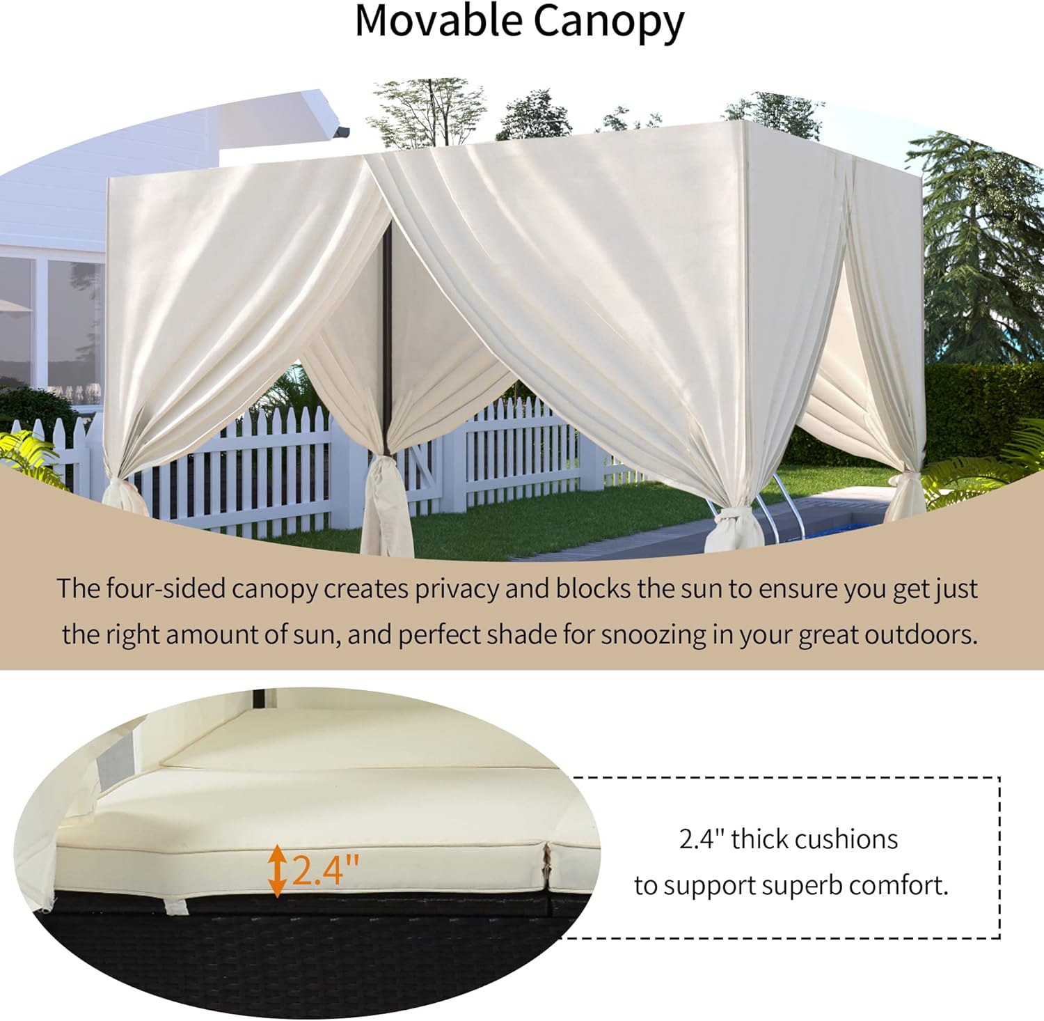 - 【Perfect Outdoor Furniture】This stylish rattan rectangle sunbed has side and overhead curtains to provide both shade and privacy. It is suitable for 2-6 people to lie or sit. Create a new vision for your balcony, garden, backyard or poolside.