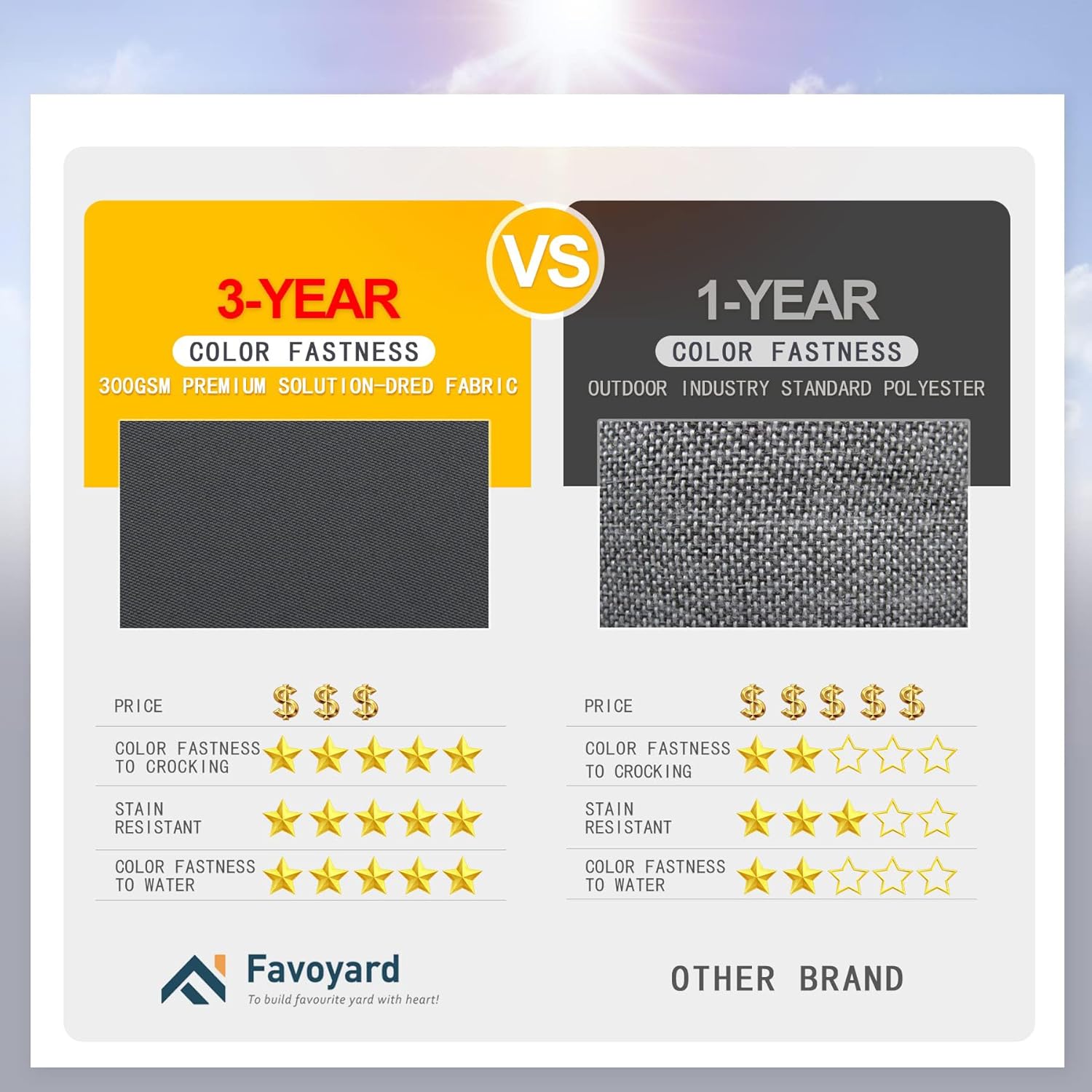 - 3-year Color Fastness - Our patio chair cushions adopt 300GSM High Density polyester fabric, thanks to the superb coloring technology, we proudly say the fading resistant is 20 times that of ordinary products, Favoyard outdoor seat cushion for patio furniture is a perfect decor in garden, patio, beach and etc.