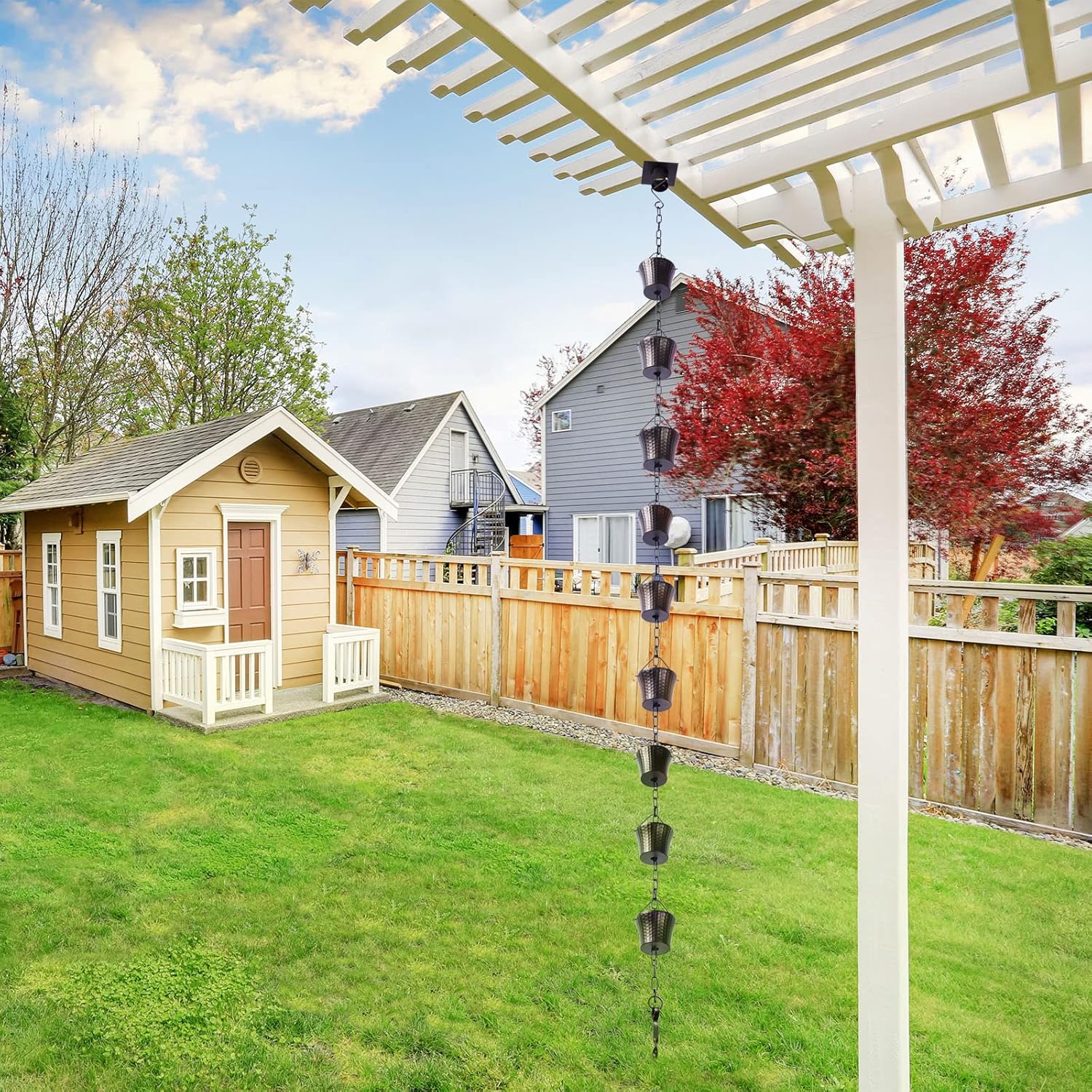 - Solid and Durable Rain Chains for Gutters:The rain chains for downspouts is made of high quality wrought Iron that is rust resistant and provides long term durability and stability. The surface is sandblasted granular black to provide an attractive cottage-style look to your yard.