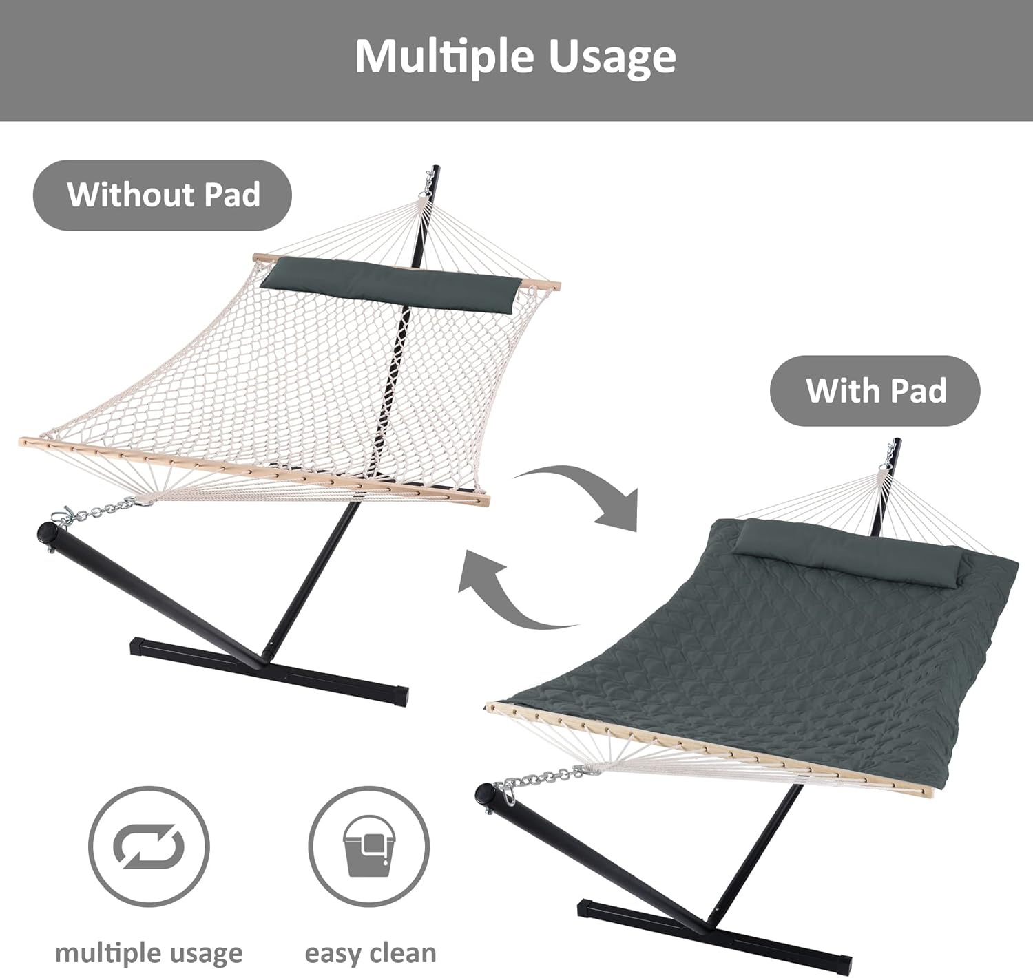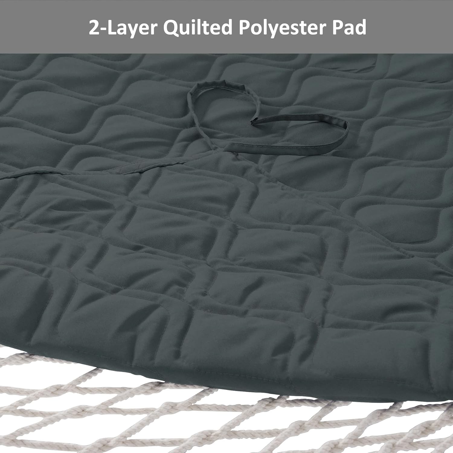 - Reversible Quilted Polyester Pad: Two-layer quilted polyester fabric with poly fiber filling is cozier, and best for camping and outdoor activities. It will not fade after long time use. And the pad is detachable for easy cleaning. A polyethylene stuffing head pillow offers superior comfort. The reinforced ties will keep the pad in place.