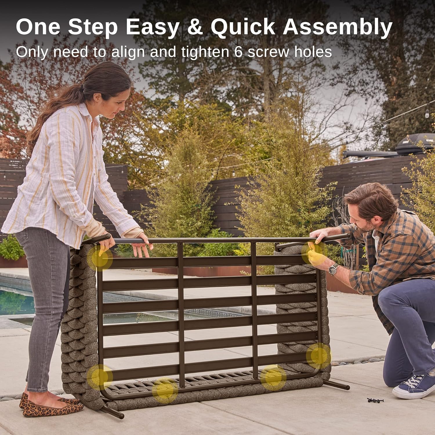 - EASY & QUICK ASSEMBLY WITHIN 5 MINUTES: East Oak outdoor furniture 2-seat sofa is easy to assemble with clear instructions and all necessary accessories included. The only need is to align the screw holes and make sure to tighten the screws only once all holes are aligned and secured. Loveseat sofa: 53.5 x 31.3 x 24.4 inches(Without table)