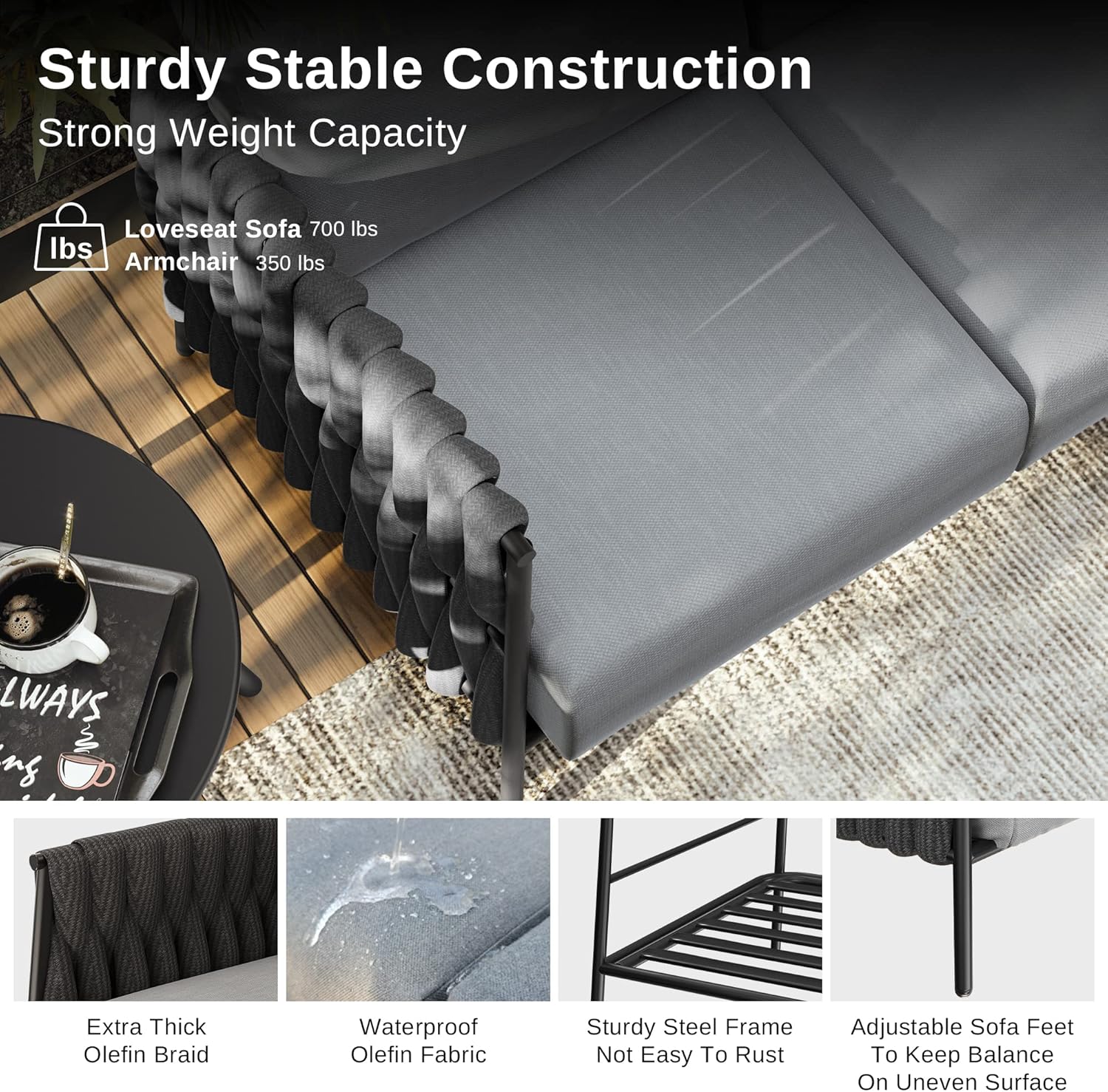 - PREMIUM MATERLIAL FOR LASTING USE: Outdoor 4 pieces patio set braided from delicate Olefin wide rope has a strong visual sense and good comfort. Olefin cushion cover plus with TPU coating treatment, and is stitched with encrypted Teslin, which has good weather resistance and is breathable. Ultra-durable Olefin is thoughtfully crafted and built to withstand the extremes of sun, rain to meet the outdoor use requirements. All the durable performance is designed to ensure long-lasting comfort