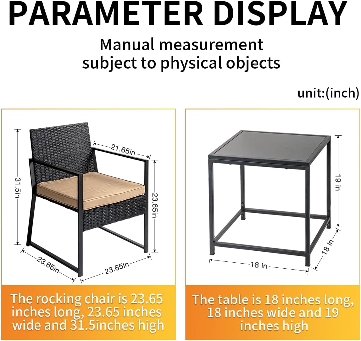 - [Package Contents & Dimensions] The package contains 1 tempered glass, 2 patio chairs, and 2 thick cushions. Additionally, the chair dimensions include 23.65(L) x 23.65(W) x 31.5(H) inches, the table dimensions include17.8(L) x 17.8(W) x 17(H) inches, with the chair weight capacity of 300 lbs, and a table weight capacity of 60 lbs.