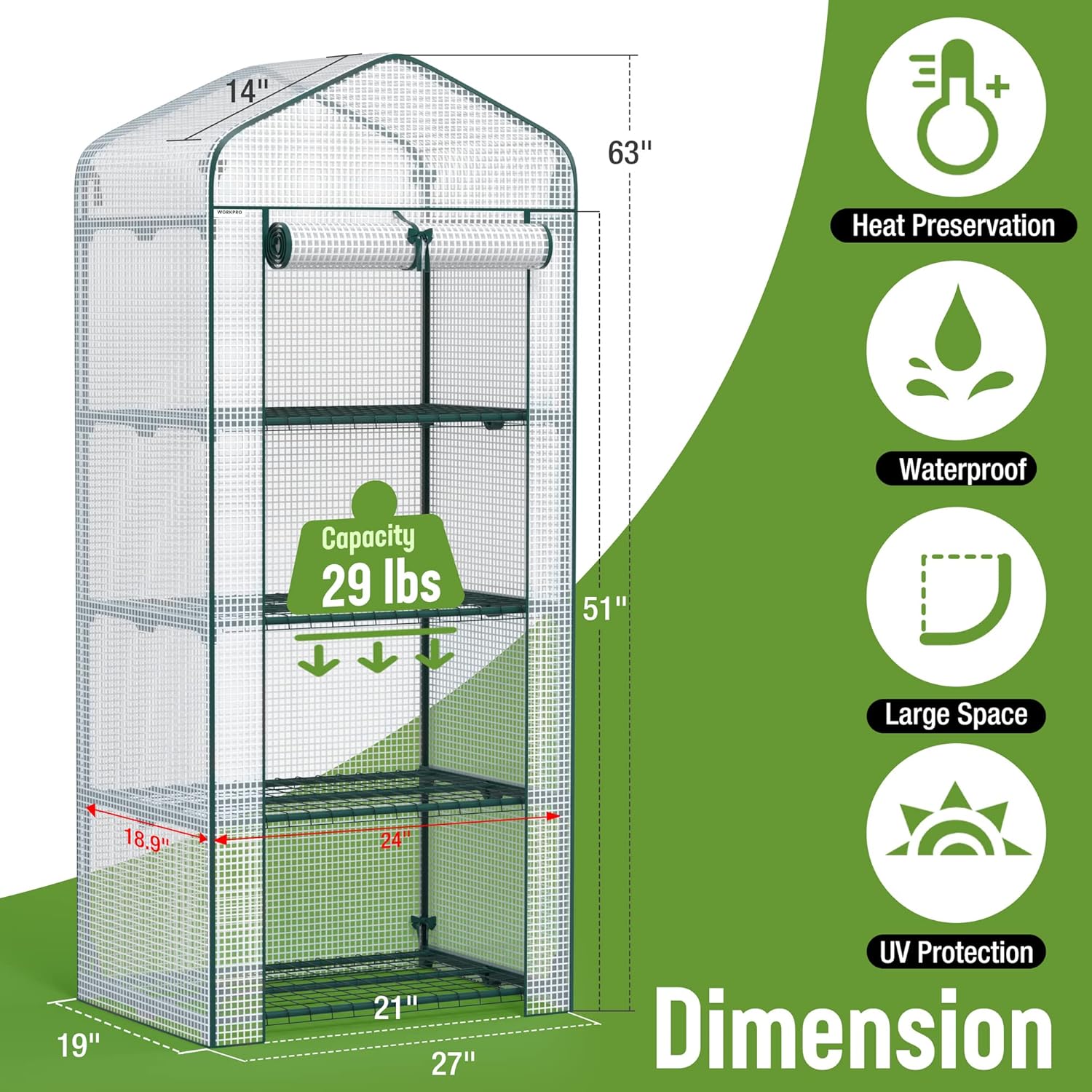 WORKPRO Mini Greenhouse, 4-Tier Portable Small Greenhouses for Outdoor Indoor with Shelves and Thicken PE Cover, White - 27" L x 19" W x 63" H, Ideal Gardening Gifts for Women Men