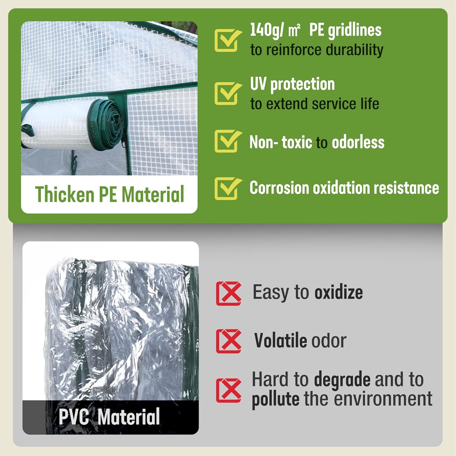 - Reinforced PE Cover & Weather Protection: Unlike typical plastic covers,this small greenhouse features a heavy-duty 140g/㎡ PE cover that is UV-resistant, waterproof, and windproof- offering excellent protection for your plants in all seasons. A must-have for greenhouses for outside in changing weather