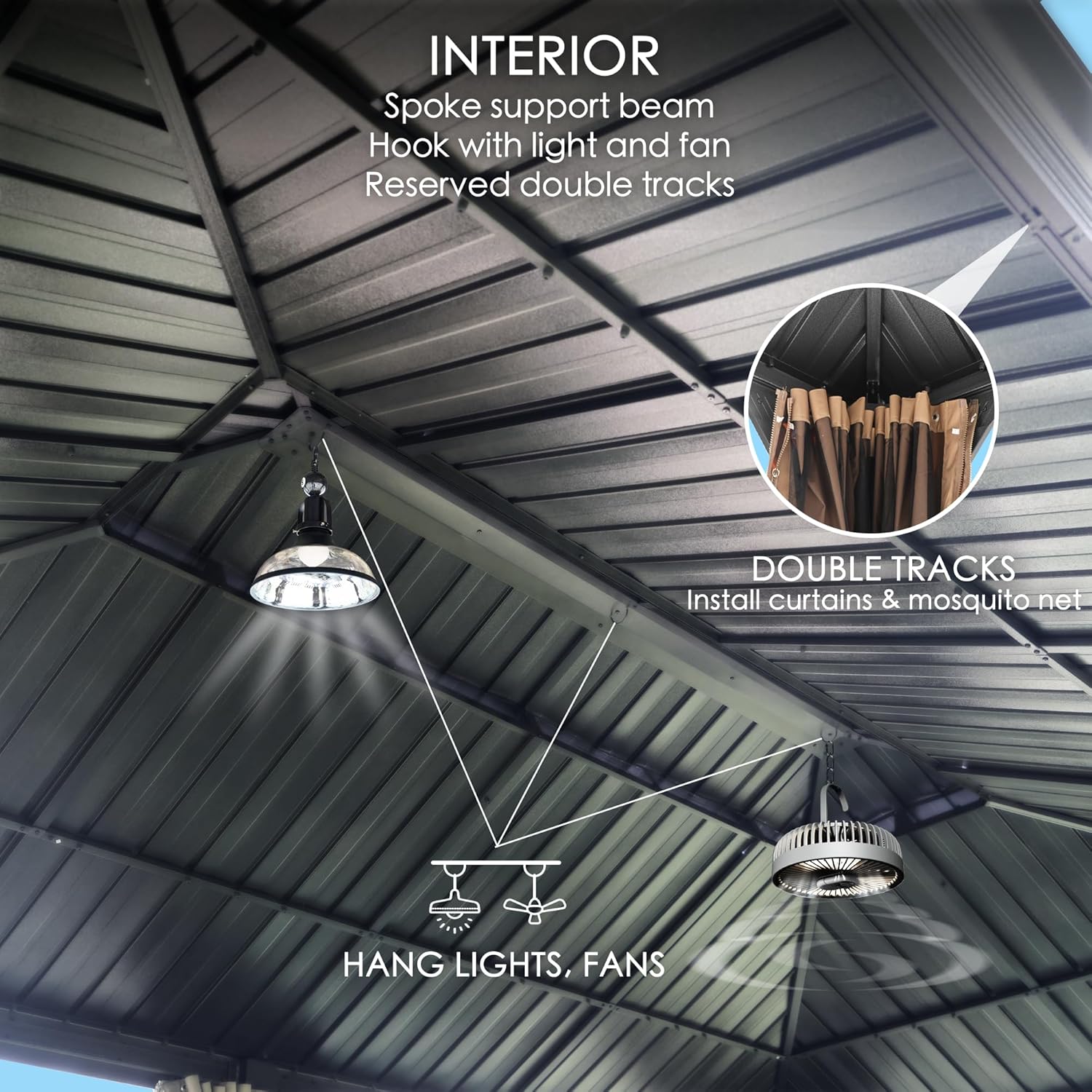 - âś…Two hooks have been specially crafted to accommodate fans or lights, enhancing the ambiance of your gazebo and making it a comfortable and inviting space.