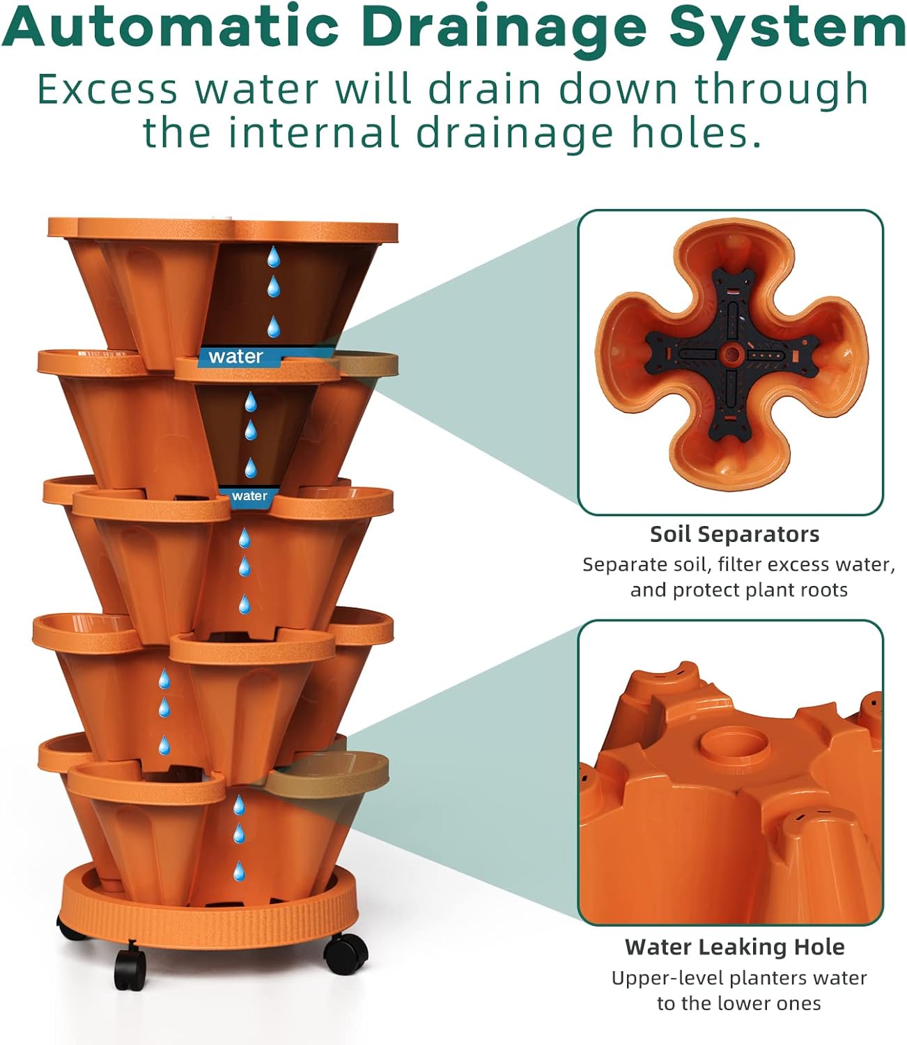 - Flow Design - The water filtration system from top to bottom can save water and retain moisture but prevents overwatering or root rot. 3 filters are placed on each level to keep the soil from going through the big drainage holes, it also helps retain water in each planter level.