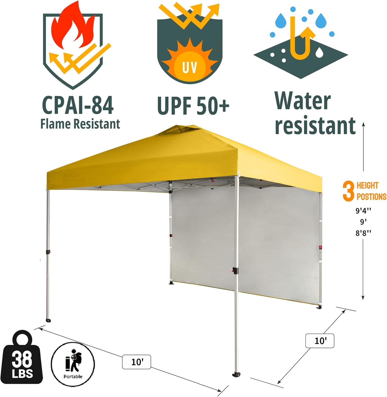 CROWN SHADES 10x10 Pop Up Canopy with 1 Side Wall - Beach Tent with One Push Setup - Outdoor Sun Shade for Events, Parties, Camping - Gazebo with STO-N-Go Cover Bag (Yellow)