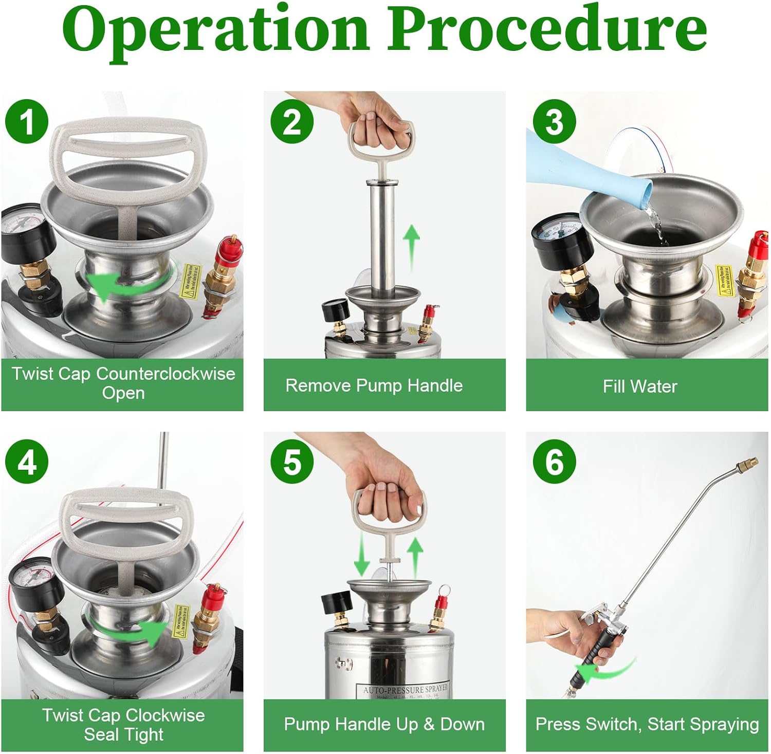 - 【WIDE APPLICATION 】- stainless steel, this sturdy sprayer is compatible with most commercial liquid fertilizers. Boasting large flow piston rod and its humanized handle, it is designed for easy use and also for quickly building up air pressure with no need for outlet or extension cord. A good choice for home, gardening, tourist vehicles, special vehicles, ships and ground cleaning.