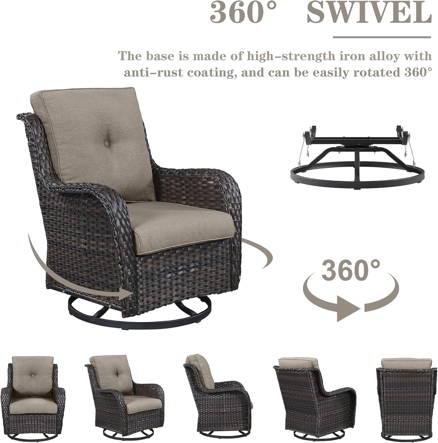 - Resistant Wicker: The patio swivel rocker chair is made of tightly woven resin wicker material, giving the wicker chair superior toughness and fade resistance. Ideal for all-weather use, it's also perfect for use on patios, porches, decks, backyards and more as a great swivel rocking chair for chatting and napping. Each wicker is hand-woven and the threads are hidden and reinforced.