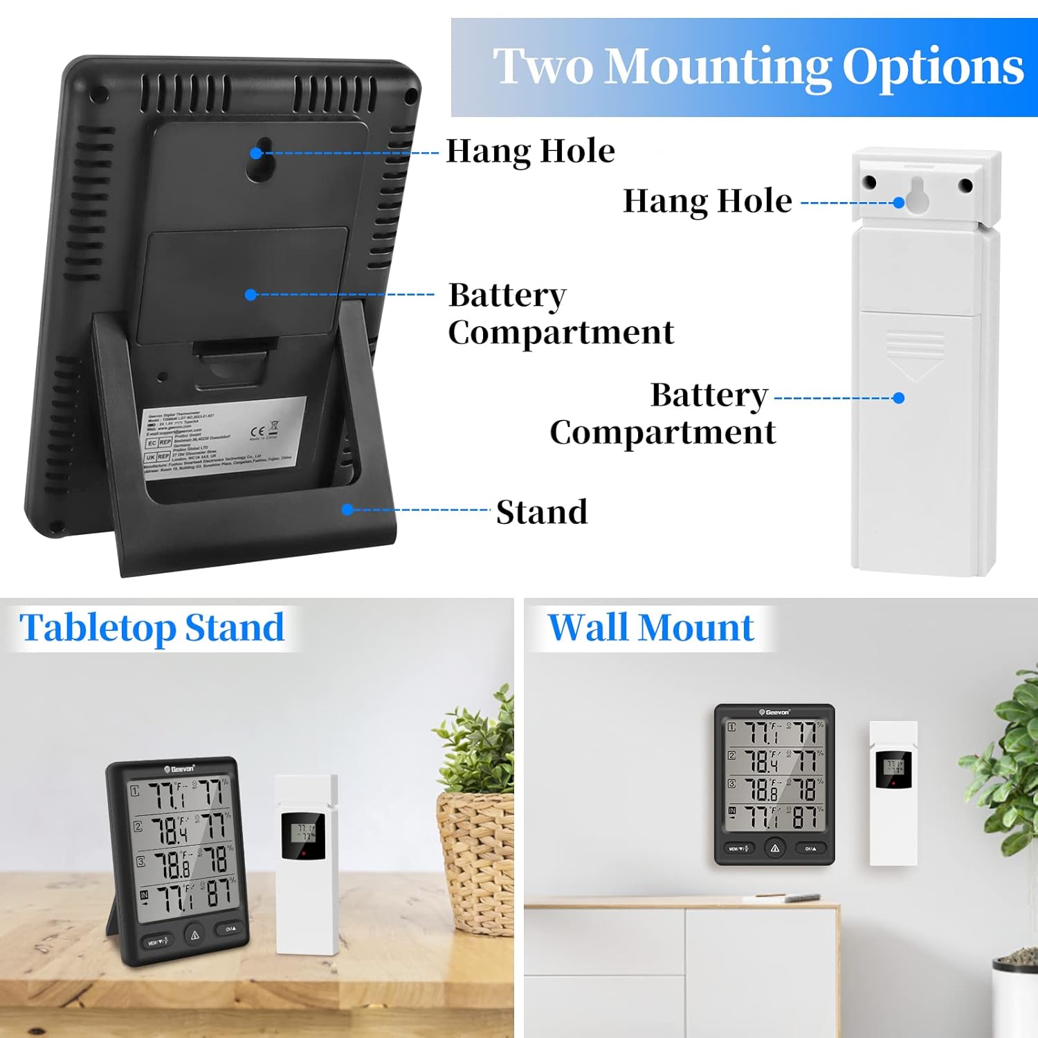 - 【Multiple Applications】Geevon 4 channel indoor outdoor thermometer can be placed on the desk or hung on the wall as you like. You can place it in your bedroom, baby room, wine cellar, basement, garden, greenhouse, grow tent, or office. The base station is powered by 2 AA Battery, and the remote sensor is powered by 2 AAA Battery(Not Included). Please let us know if there are any problems with the weather thermometers, we will do our best to solve the problem for you.