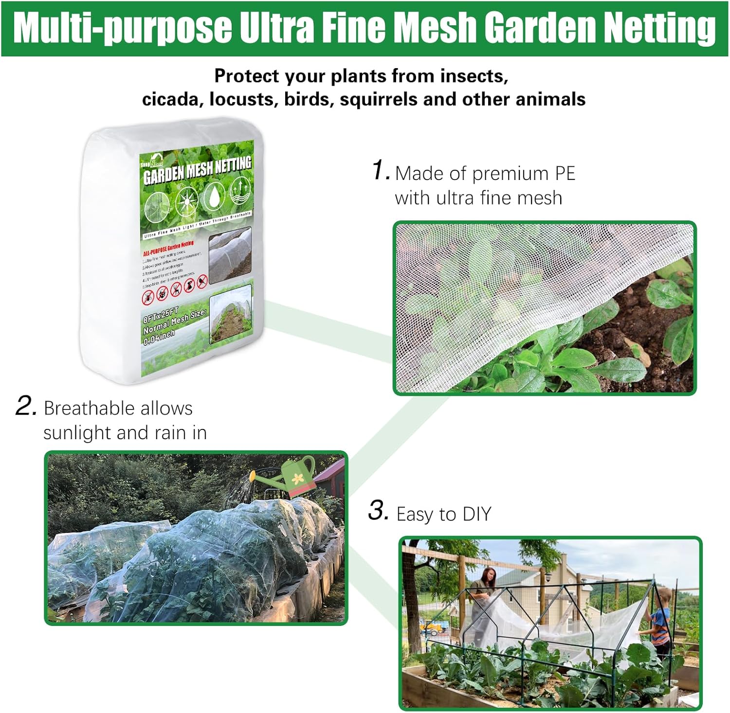 - Ultra-Fine Mesh Netting: Large size 8x25 feet provides more security. Ultra fine garden netting has a 0.8mm x1mm ultra-fine mesh, effectively protects vegetables, fruits and flowers.