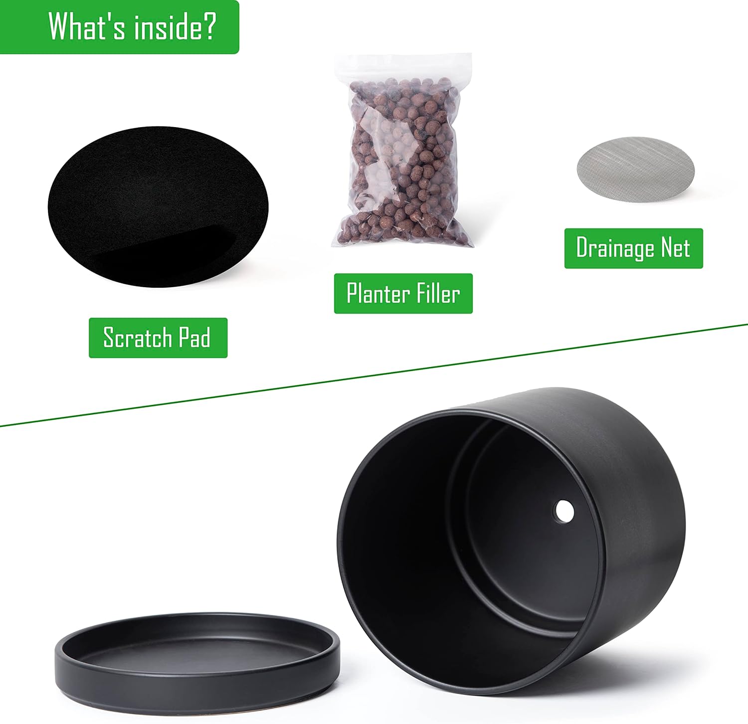 - Planter pot with drainage hole, mesh drainage net and protective scratch pad included.