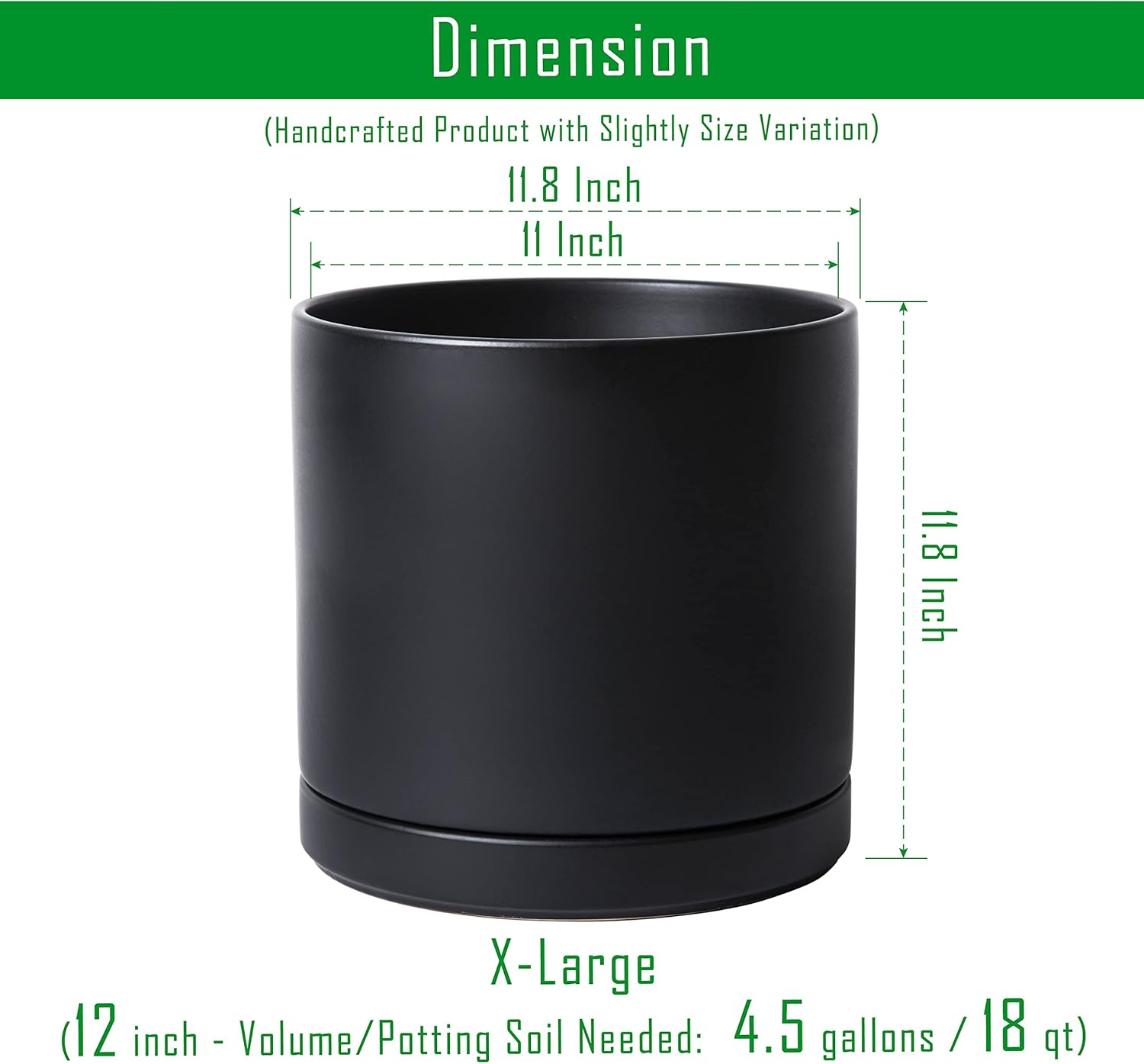 - X-Large 12 Inch Planter Pot: 11.8" Diameter x 11.8" H, black color. Potting Soil Needed: 4.5 gallons / 17 qt.