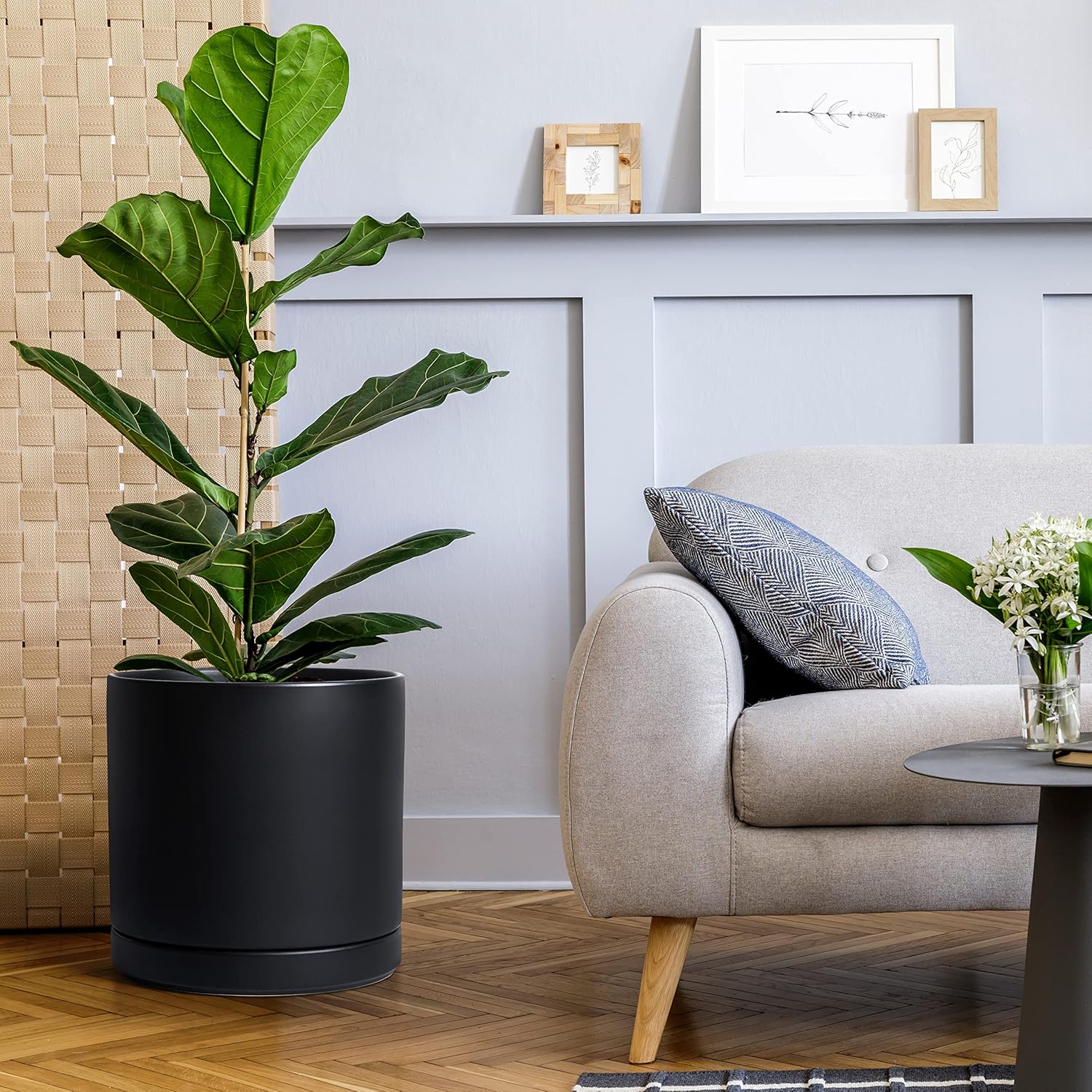 - Simple, elegant, and modern cylindrical straight round planter pot with saucer and drainage hole.