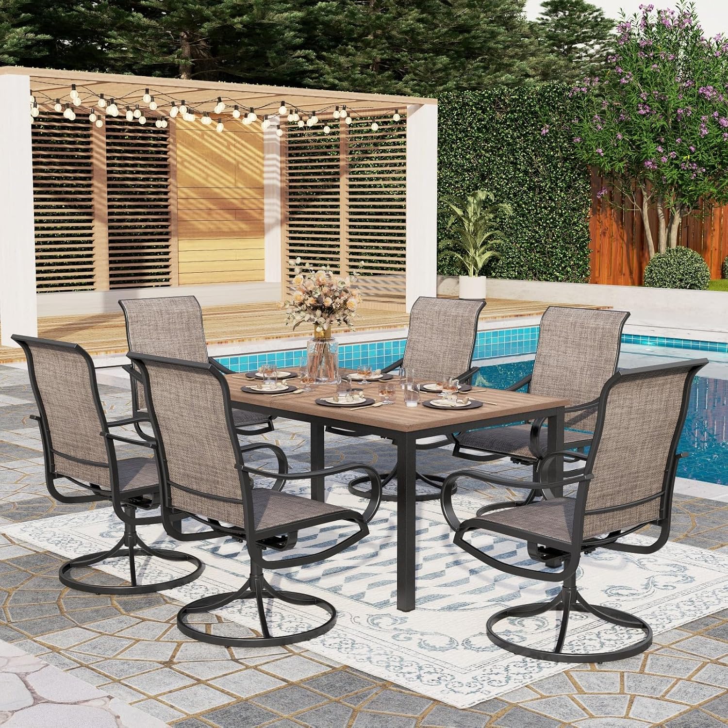PHI VILLA Patio Dining Table and Chairs, 6 Swivel Dining Chairs with Armrest, Brown Metal Slat Table Top with 1.6" Umbrella Hole, Rustproof E-Coating for All Weather