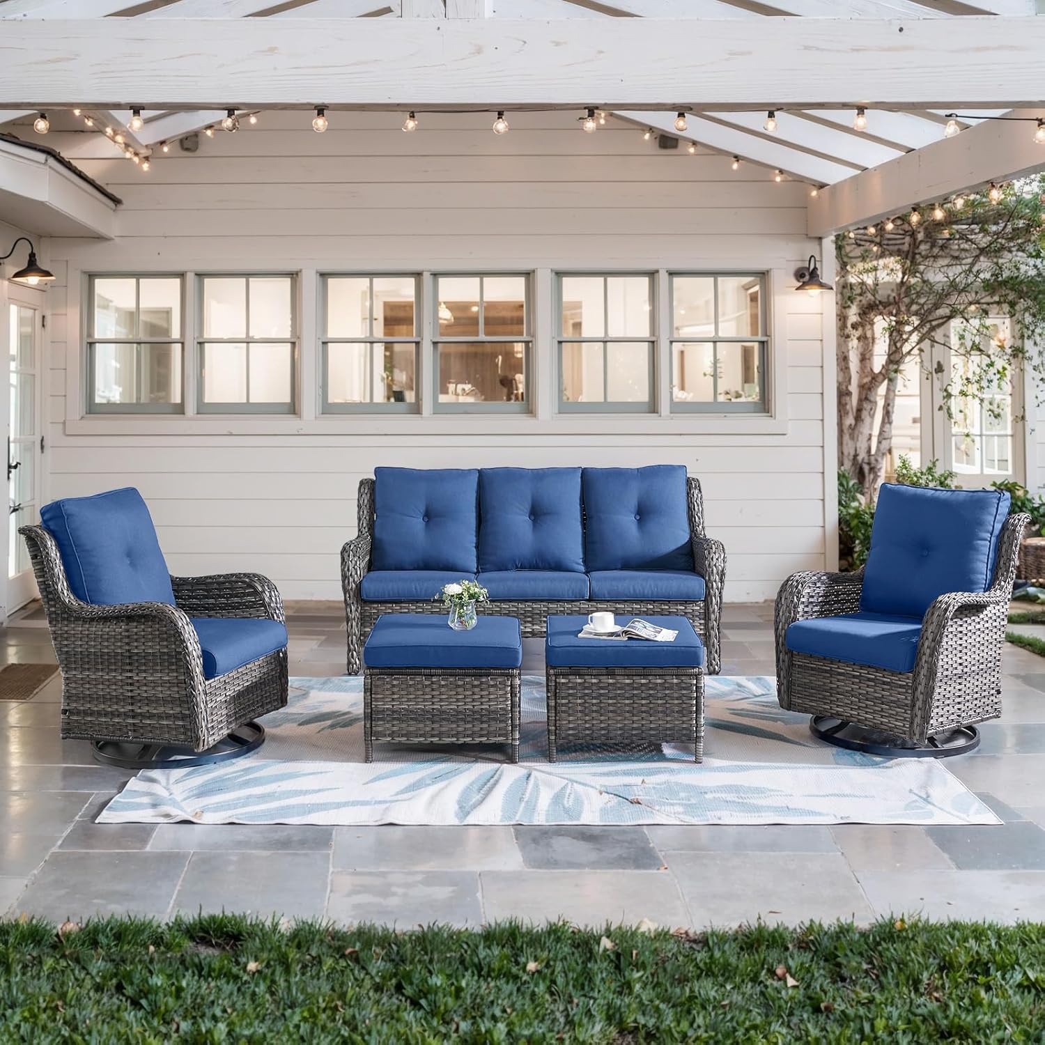 5 Piece Outdoor Patio Furniture Set - Wicker Furniture Patio Conversation Set, Outdoor Swivel Rocker Chairs with 3-Seater Sofa and 2 Ottomans for Small Space, Blue Cushion