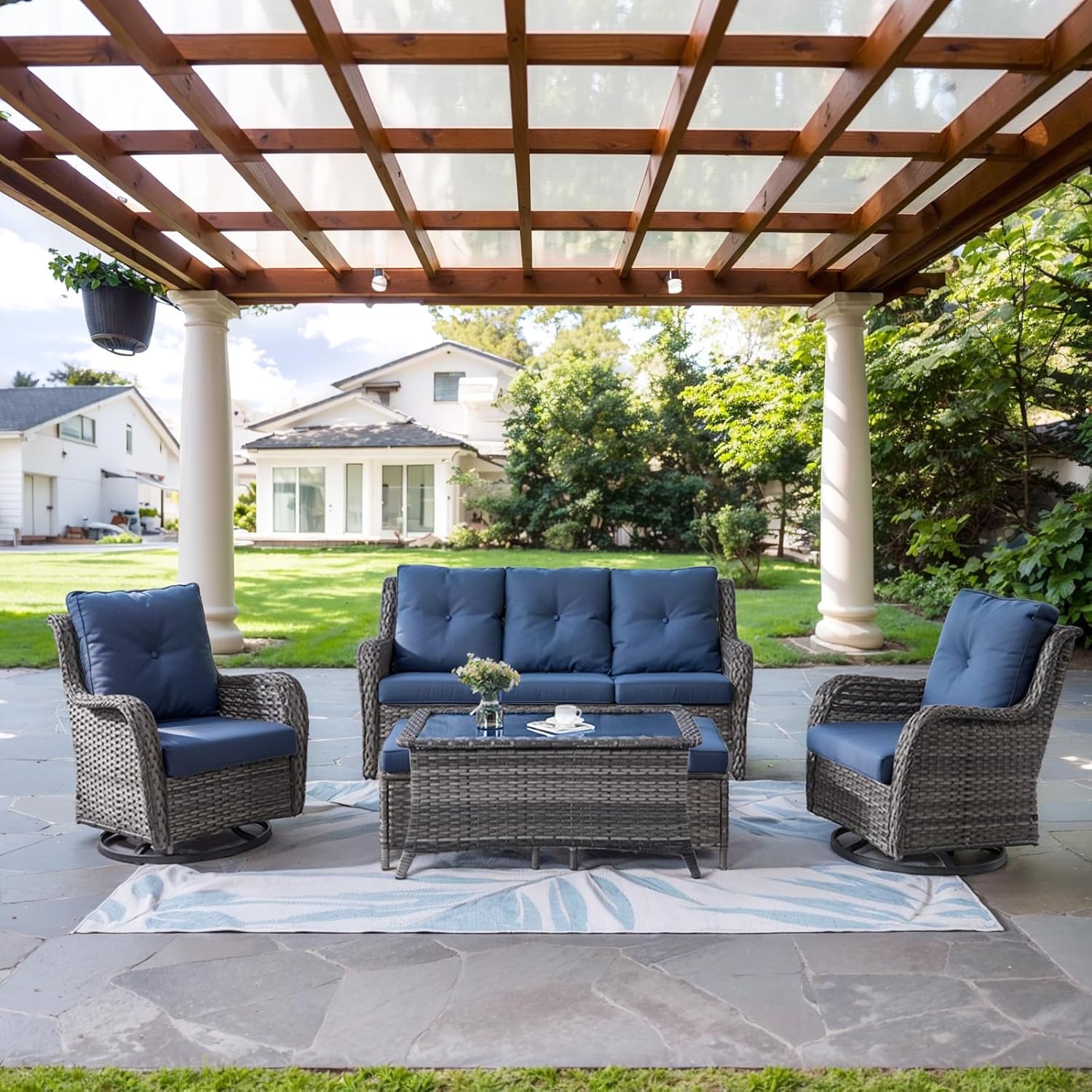 Wicker Outdoor Furniture Patio Furniture Set - 6 Piece Patio Conversation Set with Swivel Rocker Chairs, Rattan Sofa, Ottomans and Coffee Table, Blue Cushion