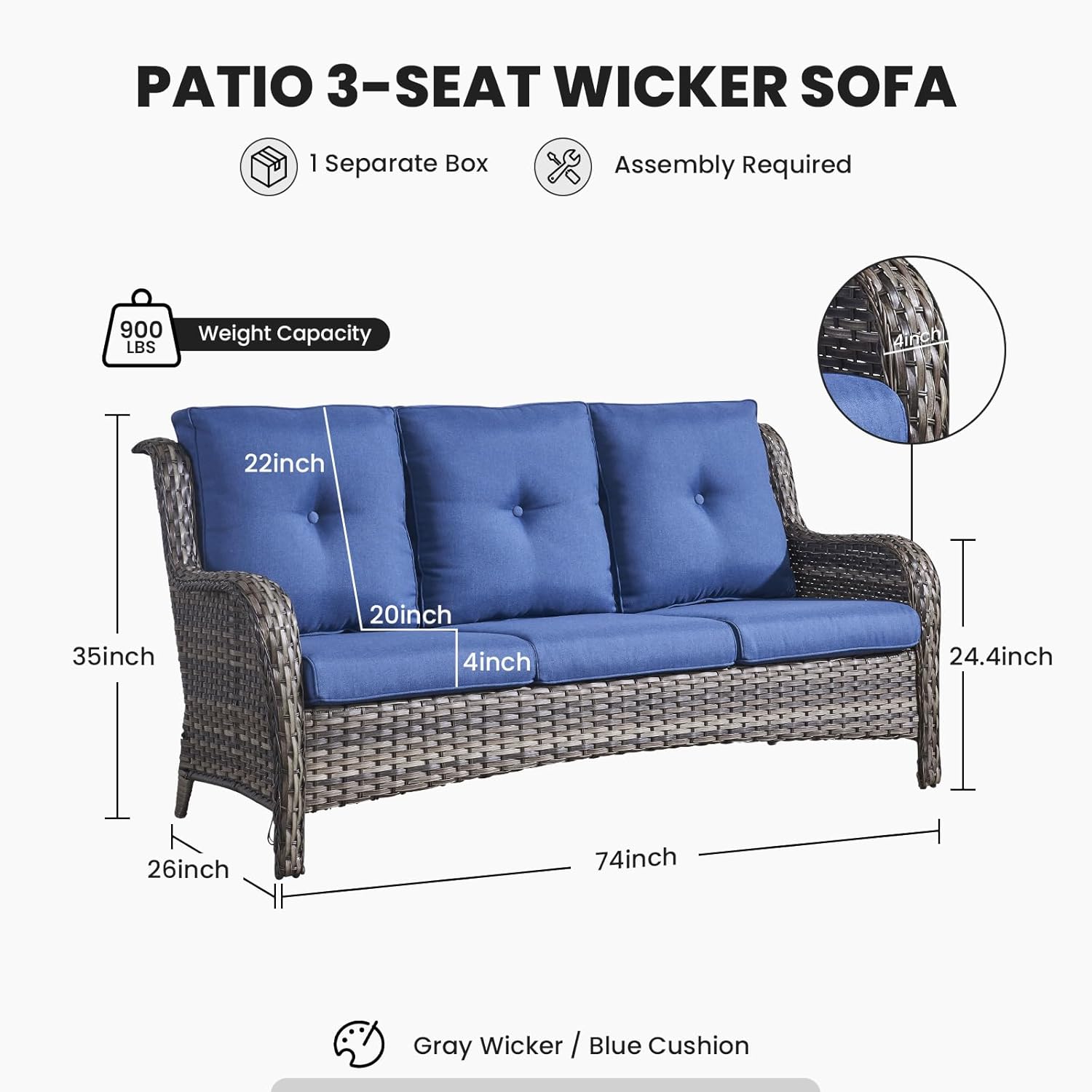 - 3.Durable Material: This outdoor wicker sofa is made of hand-woven weather-resistant PE rattan and powder-coated steel frame, which makes the sofa couch stronger and more durable. The wicker sofa can hold up to 900 pounds of weight capacity.