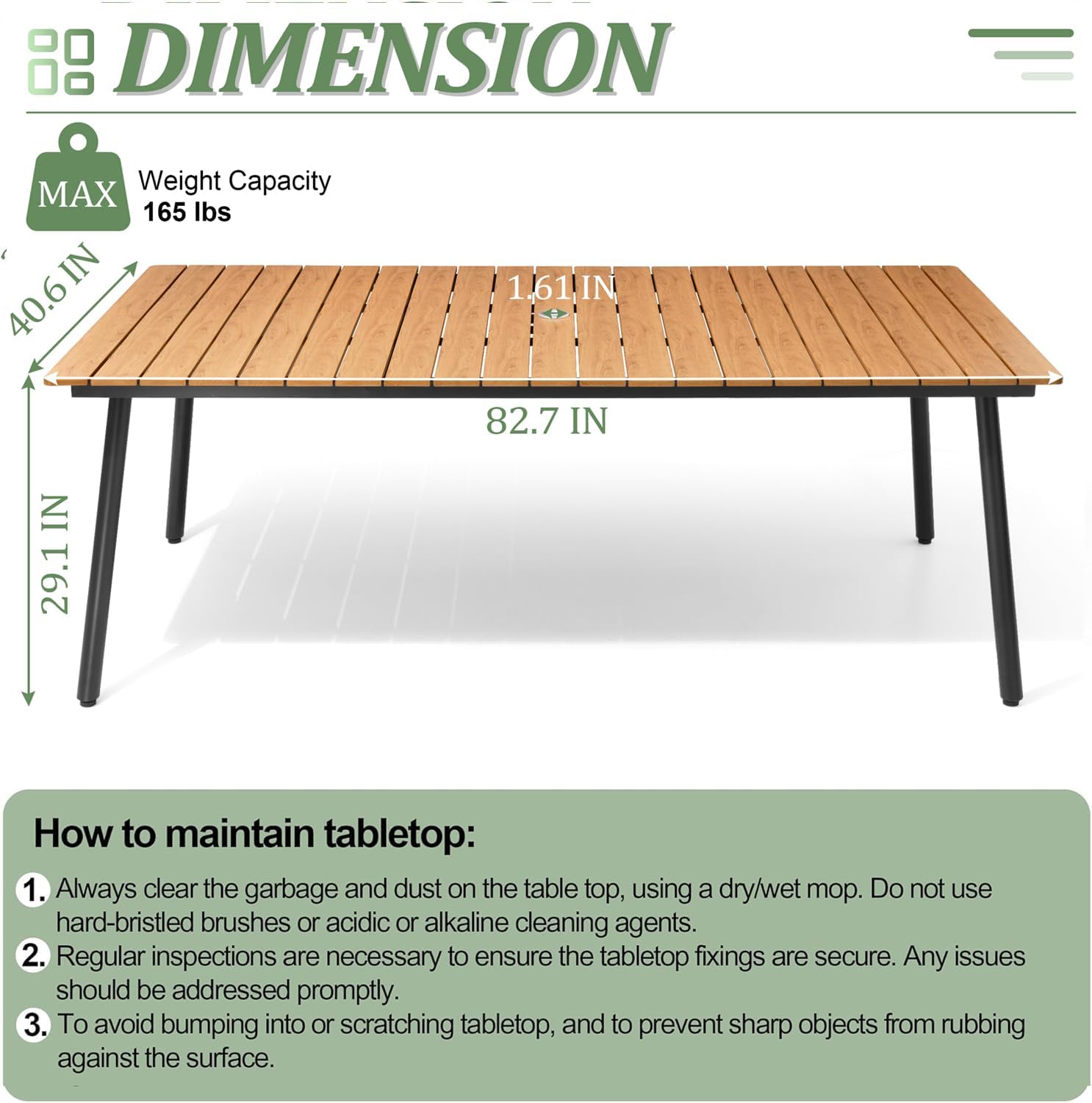 - TABLE Dimensions: This dining table is 29.1"H x 82.7"W x 40.6"D; Top length: 6.89 FT.Weight Capacity: 165lbs. Due to its lightweight design, this outdoor dining table can be easily moved to any location.
