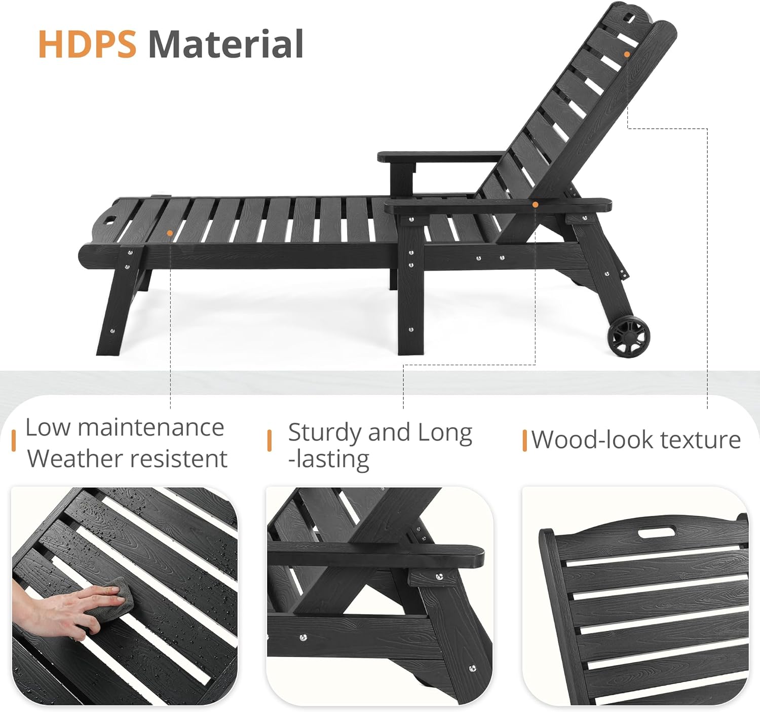 - HDPS Material: The outdoor lounge chairs is built to last with its HDPS lumber material that resists fading, cracking, and peeling, which is very sturdy and can withstand the test of outdoor environments