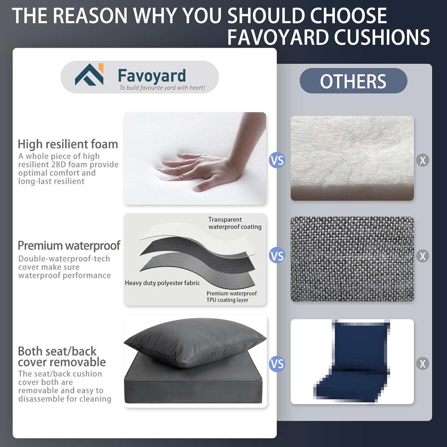 - Double-Waterproof Tech Cushion Cover: Favoyard outdoor cushions for patio furniture choose 300GSM high density polyester fabric for the cover could provide excellent waterproof and dust resistance ability. In addition, there is a TPU coating on the reverse side of the fabric. Both the TPU coating and the fabric are highly waterproof.