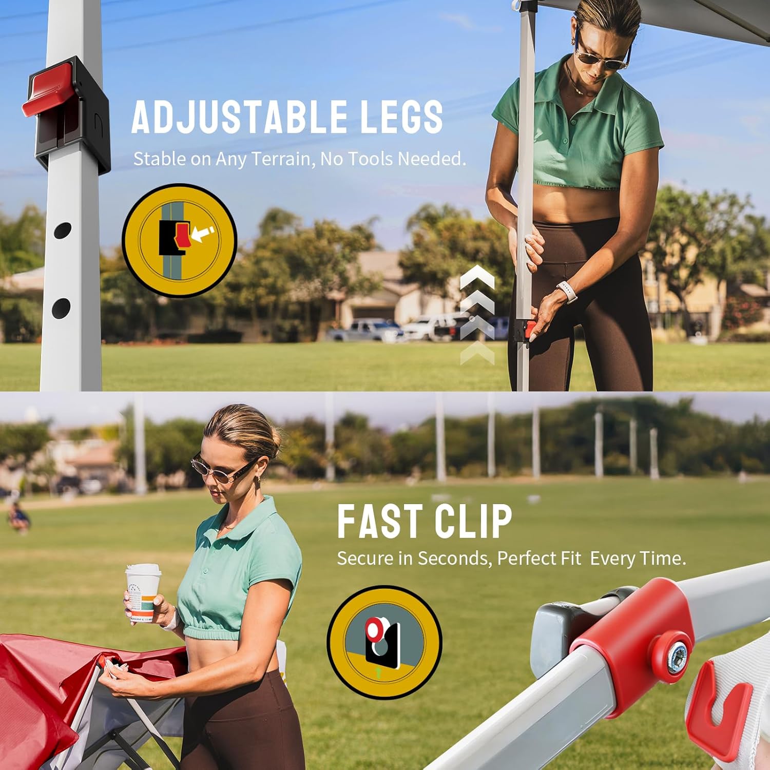 - ONE BUTTON EASY SET UP - Our 8x8 pop up canopy tent features patented one push center lock tech. With just a single push, the central hub locks the poles in place. Designed for the next generation, this outdoor canopy for patio can be set up by two people in seconds without any tools. Three adjustable height settings with soft, pinch-free buttons ensure convenience and safety, making it perfect for camping, beach outings, craft fairs, tailgating, farmer markets, outdoor BBQs, and more
