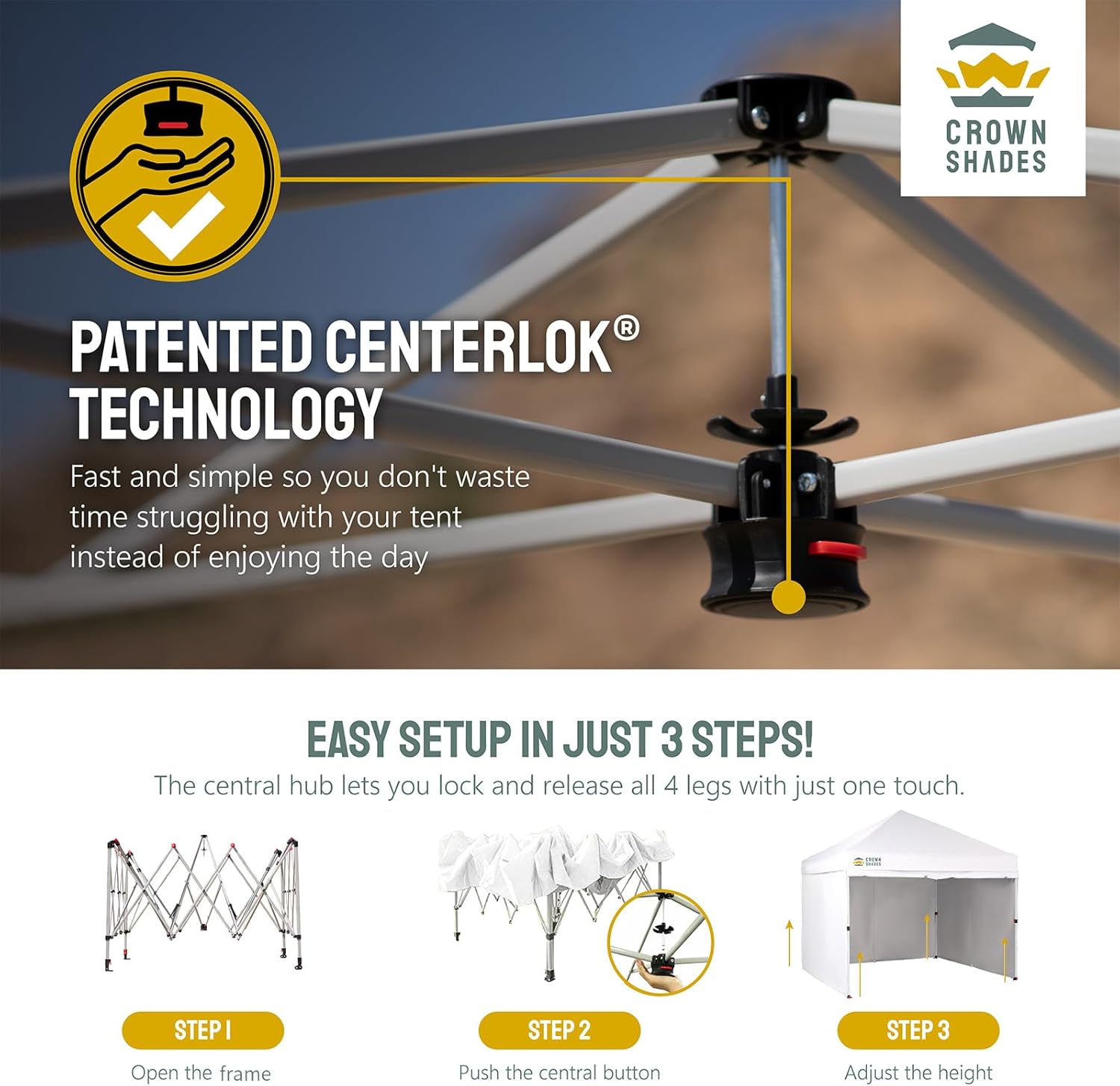- [EASIEST SET UP]: The patented central lock technology allows you to lock all four legs with a single push at the center hub. The leg height can then be adjusted using soft, pinch-free buttons. The next-generation canopy has been designed for ease of use, allowing two people to set it up in a matter of seconds without the need for any tools.
