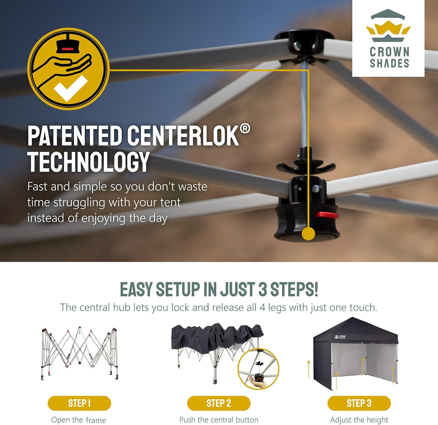 CROWN SHADES 10X10 Comercial Instant Canopy Pop Up Tent with Center Lock (10x10 with 4 Sidewalls, Black)