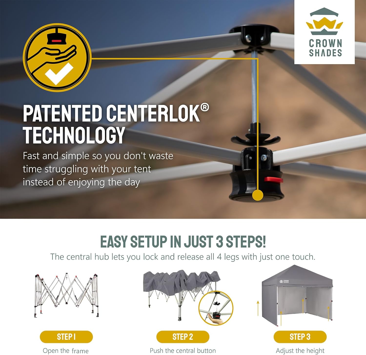 - [EASIEST SET UP]: The patented central lock technology allows you to lock all four legs with a single push at the center hub. The leg height can then be adjusted using soft, pinch-free buttons. The next-generation canopy has been designed for ease of use, allowing two people to set it up in a matter of seconds without the need for any tools.