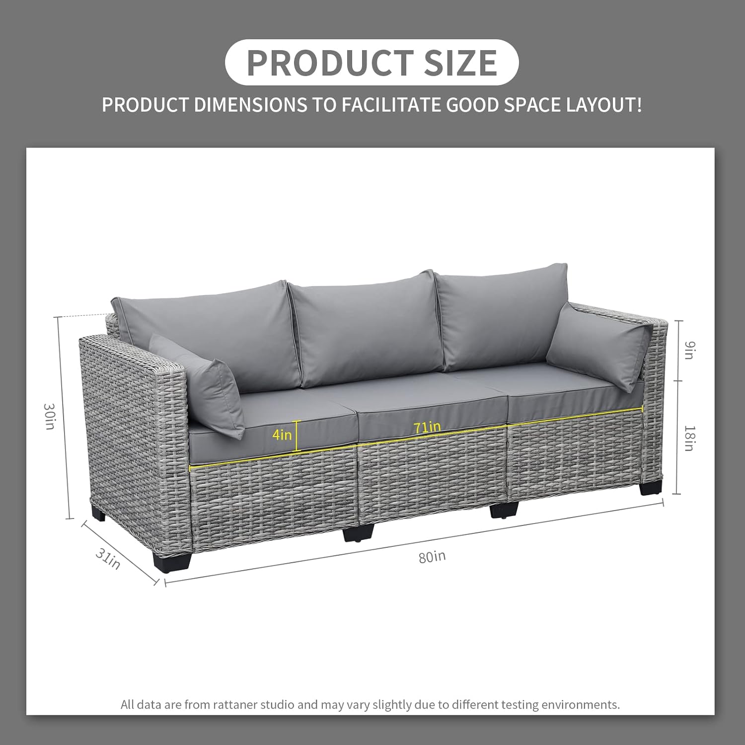 Rattaner Outdoor Furniture Outdoor Couch Grey Wicker Patio Furniture 3-seat Sofa Deep Seat Hight Backrest with Waterproof Cover and Anti-Slip Cushions, Grey