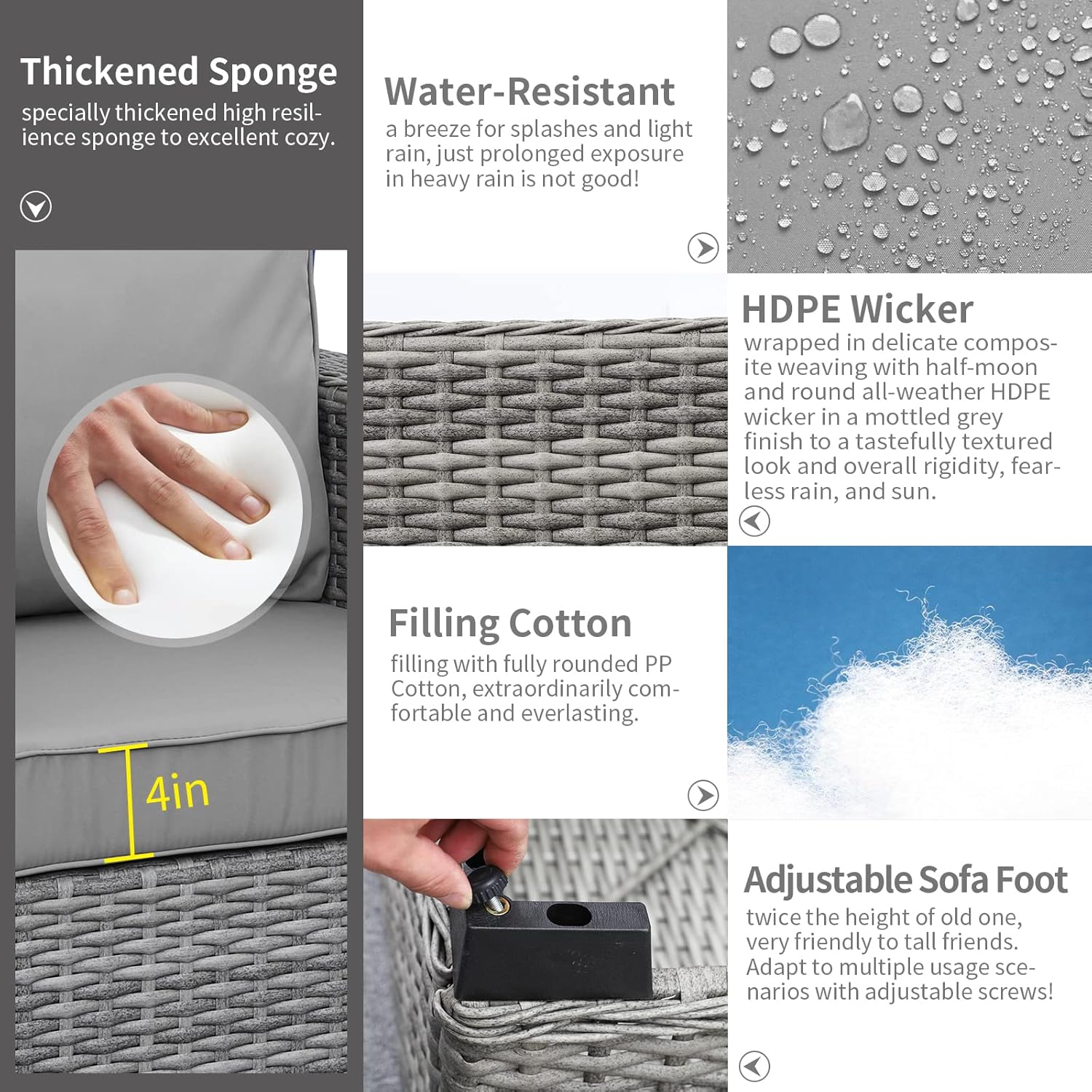 - Quality & Maintain: Delicate composite weaving with half-moon and round all-weather HDPE wicker material handwoven over fully-welded powder-coated steel framing makes outdoor patio furniture very durable and sturdy. Breathable 250G polyester Anti-UV and water-repellent fabric. Each piece is designed to withstand sunshine beating down and rainstorms rolling through.