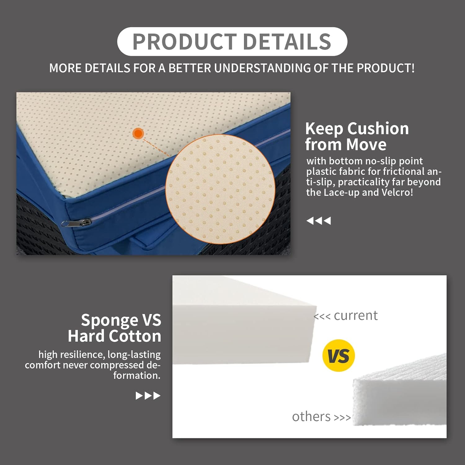 - Comfortable & Non-slip: Thickened seat cushions(4") with high resilience sponge and bottom anti-slip dotted plastic fabric, anti-slip and practicality are wholly better than lacing, velcro or hook, match up filling back cushions, which is extraordinarily comfortable and everlasting. Plus, lumbar pillows are free and style randomly.