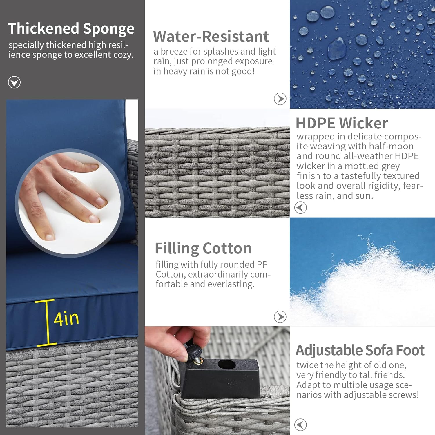 - Quality & Maintain: Delicate composite weaving with half-moon and round all-weather HDPE wicker material handwoven over fully-welded powder-coated steel framing makes outdoor patio furniture very durable and sturdy. Breathable 250G polyester Anti-UV and water-repellent fabric. Each piece is designed to withstand sunshine beating down and rainstorms rolling through.
