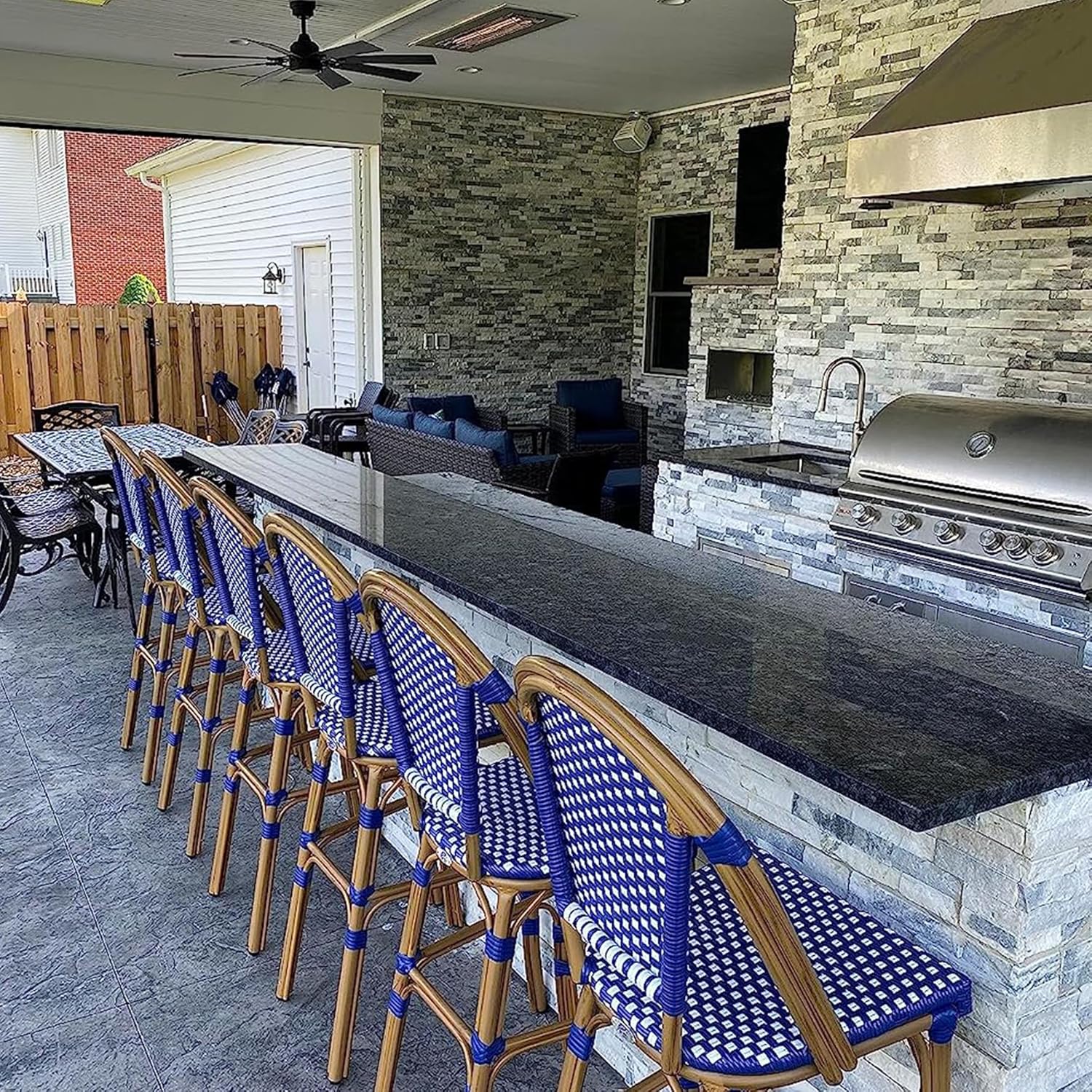 PURPLE LEAF French Bar Stool Set of 4 Bamboo Print Finish Patio Bar Stools with Back Rattan Bar Chairs Wicker Bar Height Stool 30" with Footrest Kitchen Island Stools Outdoor Barstool Royal Blue