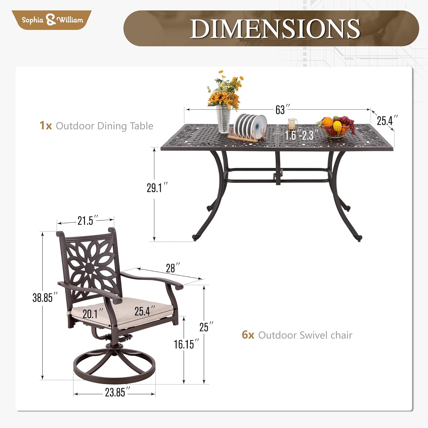 - Flawless Design: The cast aluminum tables and chairs are heated to melt in a certain proportion, then poured into the mold, cooled, and shaped. This process creates a flawless, nice, and elegant overall structure without any welding traces. Dimension: Table 63.6L x 37.2W x 29.1โH, umbrella hole 2.3. Chair 25.6โD x 25.6โW x 37.0โH, seat 20W x 20D, max load capacity up to 350 lbs
