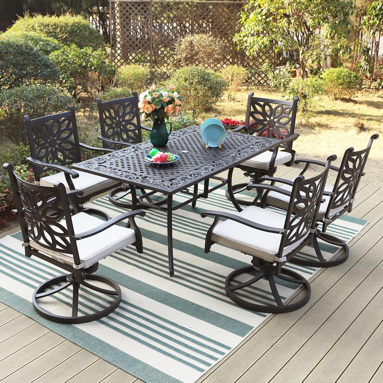 - Longer Service Life: Cast aluminum dining tables and chairs have good waterproof and UV protective performance. It can be placed outdoors all year round with no color changes. It is fireproof, scratch-resistant and rain resistant. It is strong and compressive, so as to bear heavy pressure but not easy to be deformed and damaged. Compared with outdoor furniture of other materials, it's service life will be longer