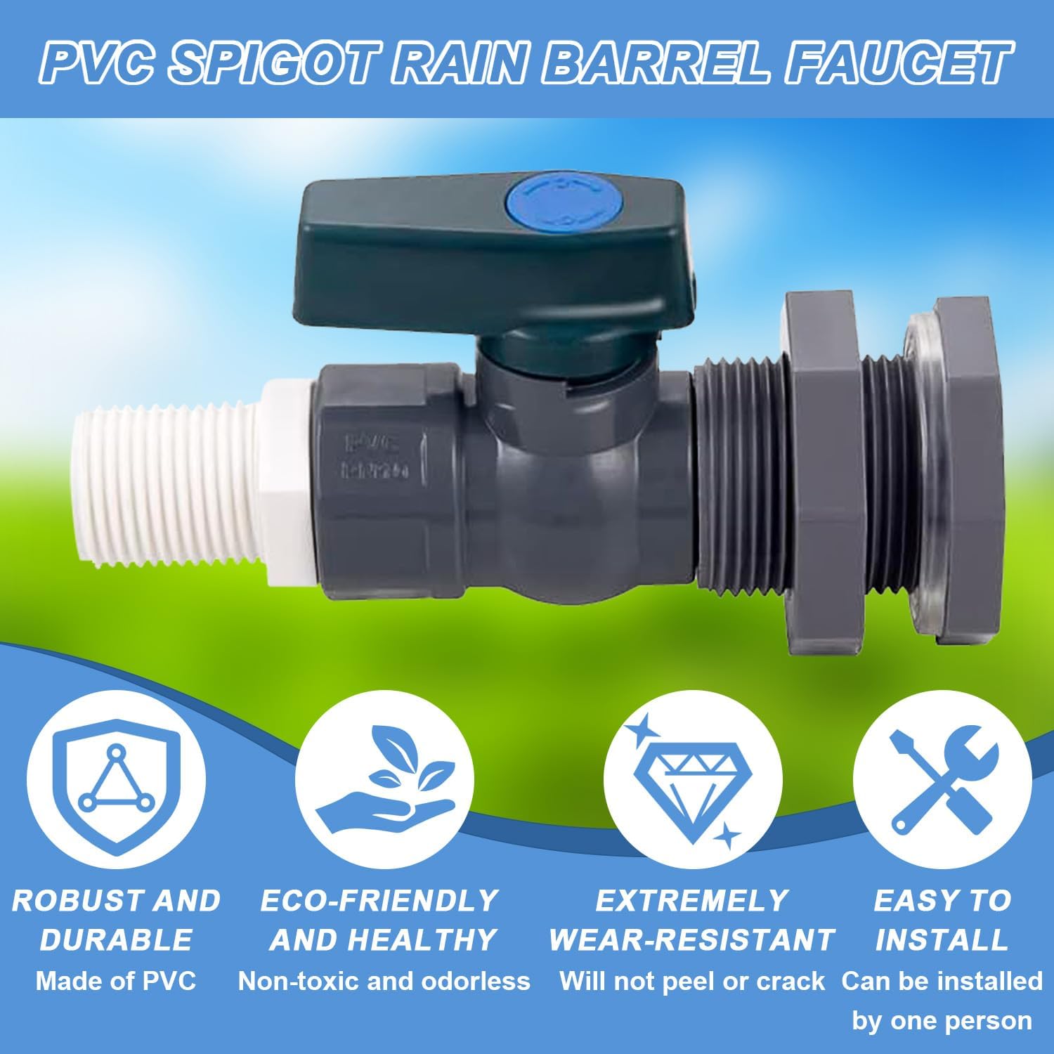 - Set: This rain barrel faucet set includes two 3/4-inch GHT PVC ball valves, two 3/4-inch heavy-duty plastic components, two straight connectors, and thread sealing tape for seamless connection to a garden hose.