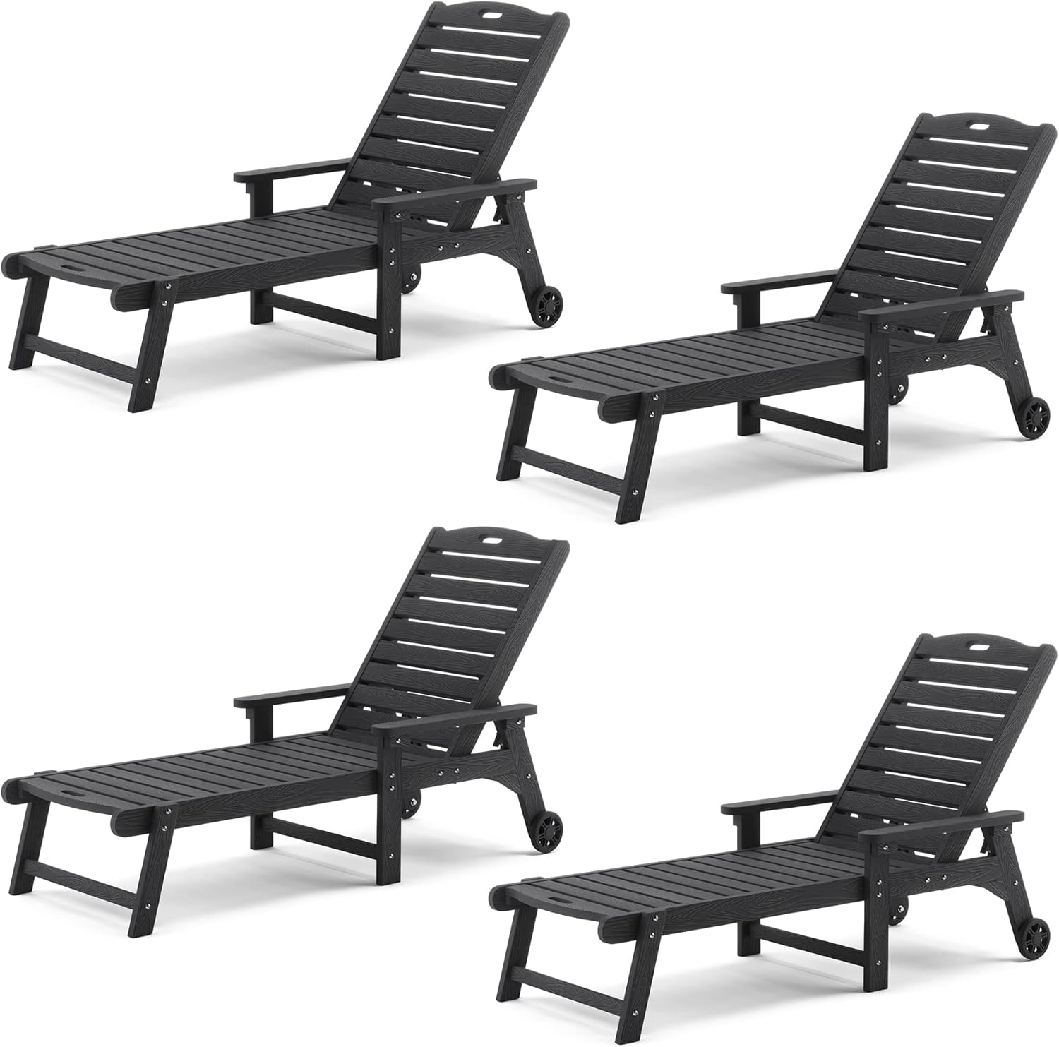LUE BONA Outdoor Chaise Lounge Chairs Set of 4, 79'' Oversized HDPS Chaise Lounger, 5 Positions Adjustable Lounge Chairs, Pool Lounge Chair with Wheels for Poolside, 3 Year Warranty, Black