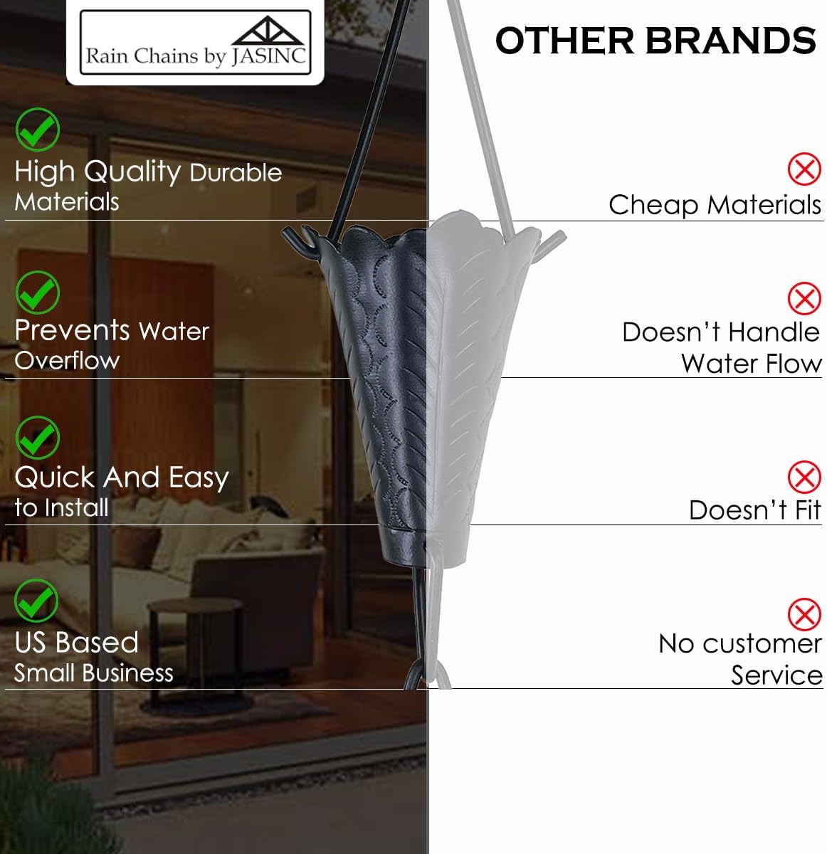 - RAIN CHAINS BY JASINC QUALITY ASSURANCE: we use only top quality materials for all our rain chains and accessories. We focuses on preventing defects, enhancing reliability, and maintaining customer satisfaction through continuous improvement.