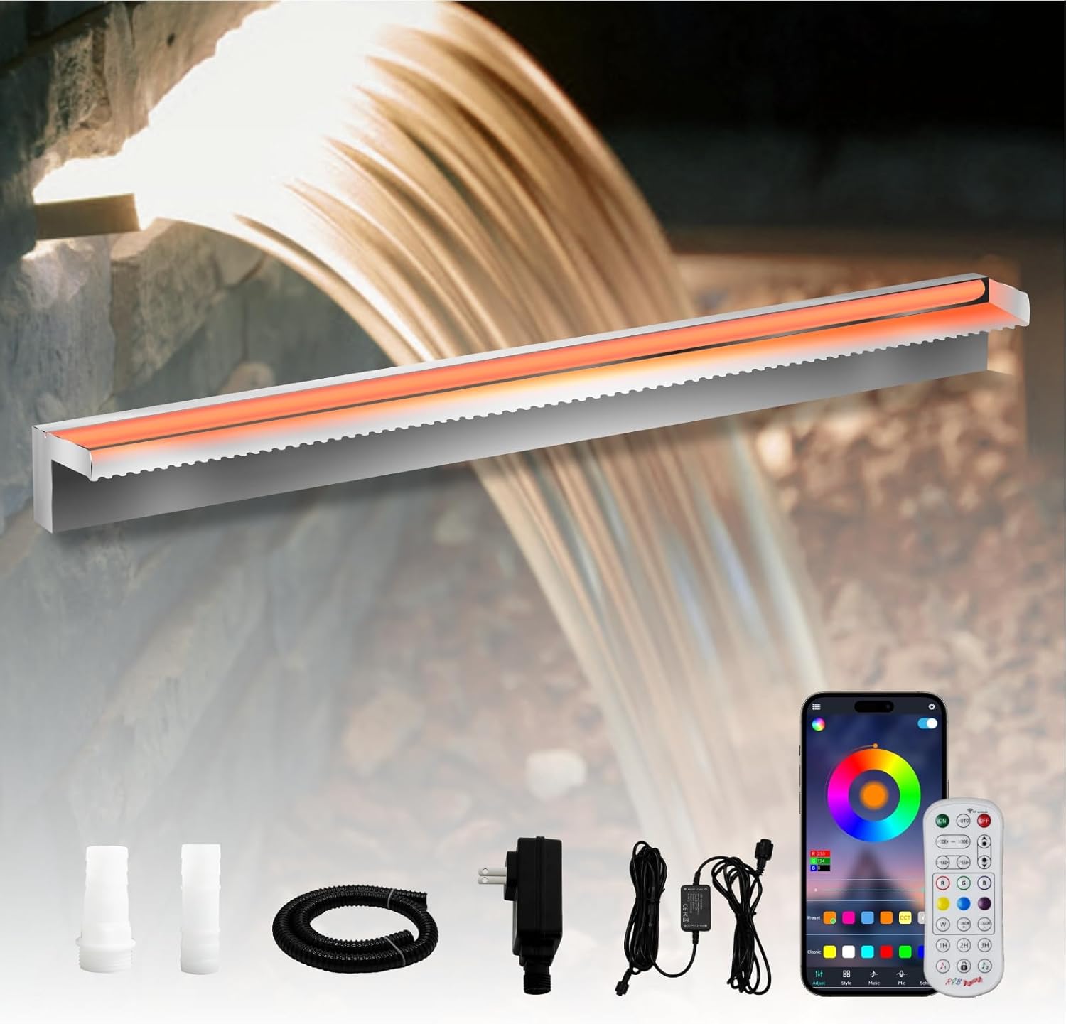 Pond Waterfall Spillway Stainless Steel Pool Fountain, APP Control LED Lighted Waterfalls Kit, Outdoor Water Flow Waterfalls Kit for Garden Patio Koi Pond Decoration-35.4"x7.8"x3.9"