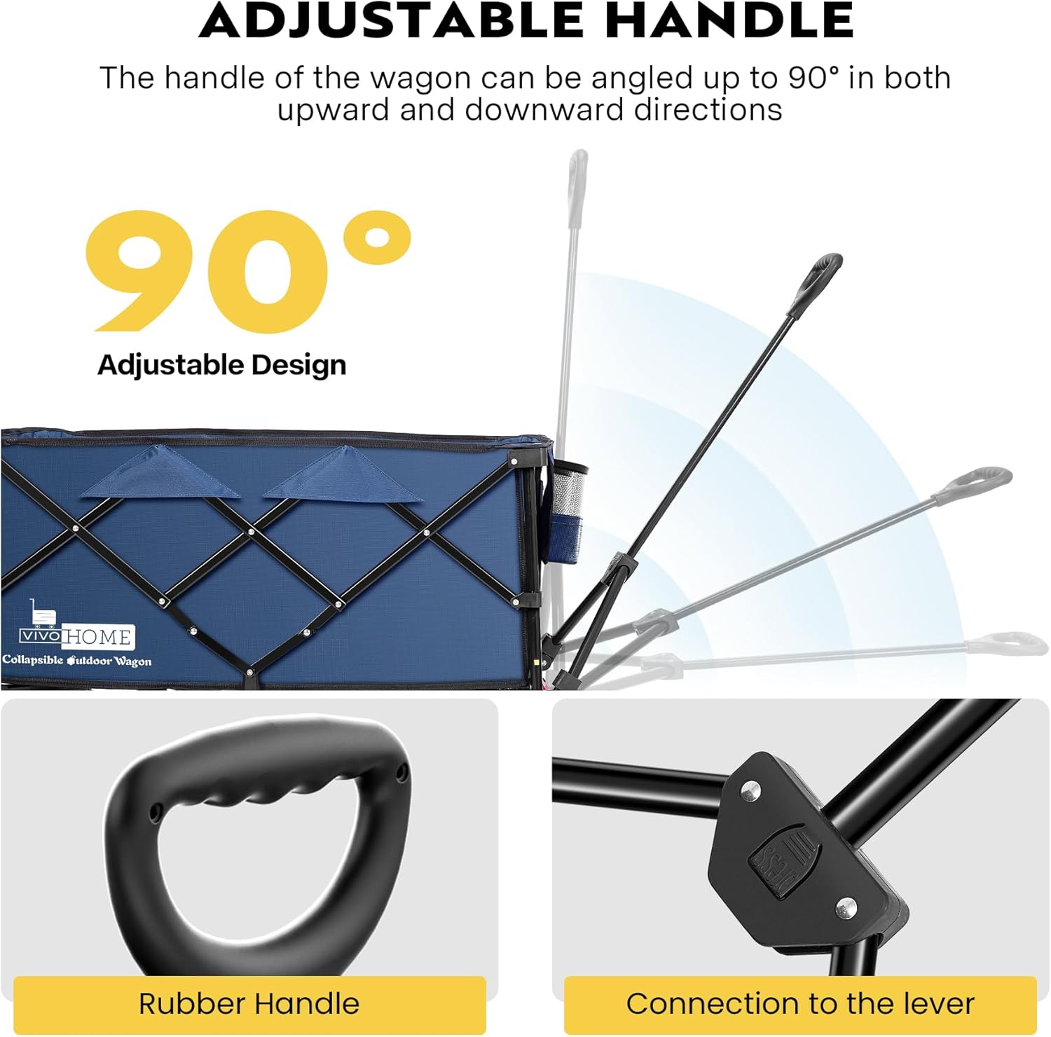 - ADJUSTABLE HANDLE - The handle of the folding cart is adjustable and can be angled up to 90° in both upward and downward directions; With an extended handle up to a maximum length of 41.7 inches, the wagon can be easily maneuvered even when carrying heavy loads, ensuring a smooth and effortless pulling experience; The grip of the handle is ergonomically designed, which enhances the user's comfort and reduces the effort required when pulling the wagon