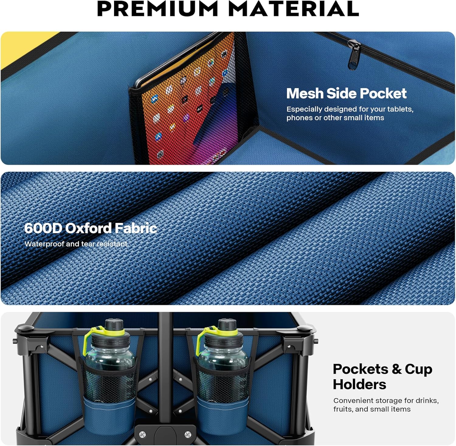 - PREMIUM MATERIAL - Made of 600D Oxford fabric with a PVC coating, the wagon cart is waterproof, tear-resistant, and durable; With a heavy-duty steel frame, it can support up to 300 lbs.; The cart features 4 universal wheels that can be easily adjusted to any angle while moving; Each of the front 2 wheels is equipped with a brake, providing extra stability when parking; This utility cart is a great option for anyone looking for a compact and reliable solution