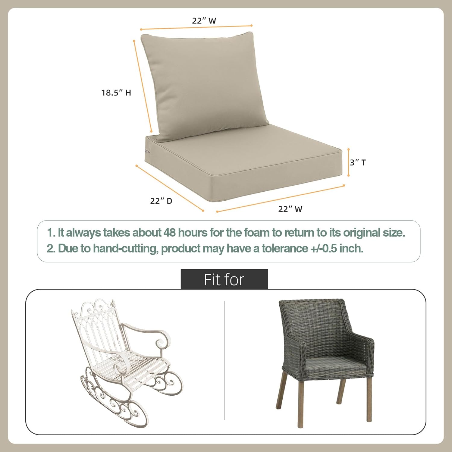 - Size Selection: Measure your chair’s seat (width x depth) before purchase. Cushion dimensions: 22x22x3 inches (seat), 22x18.5 inches (back). Note: Due to vacuum packaging, allow 48 hours for full expansion, and expect minor size variations of +/- 0.5 inch from manual crafting.