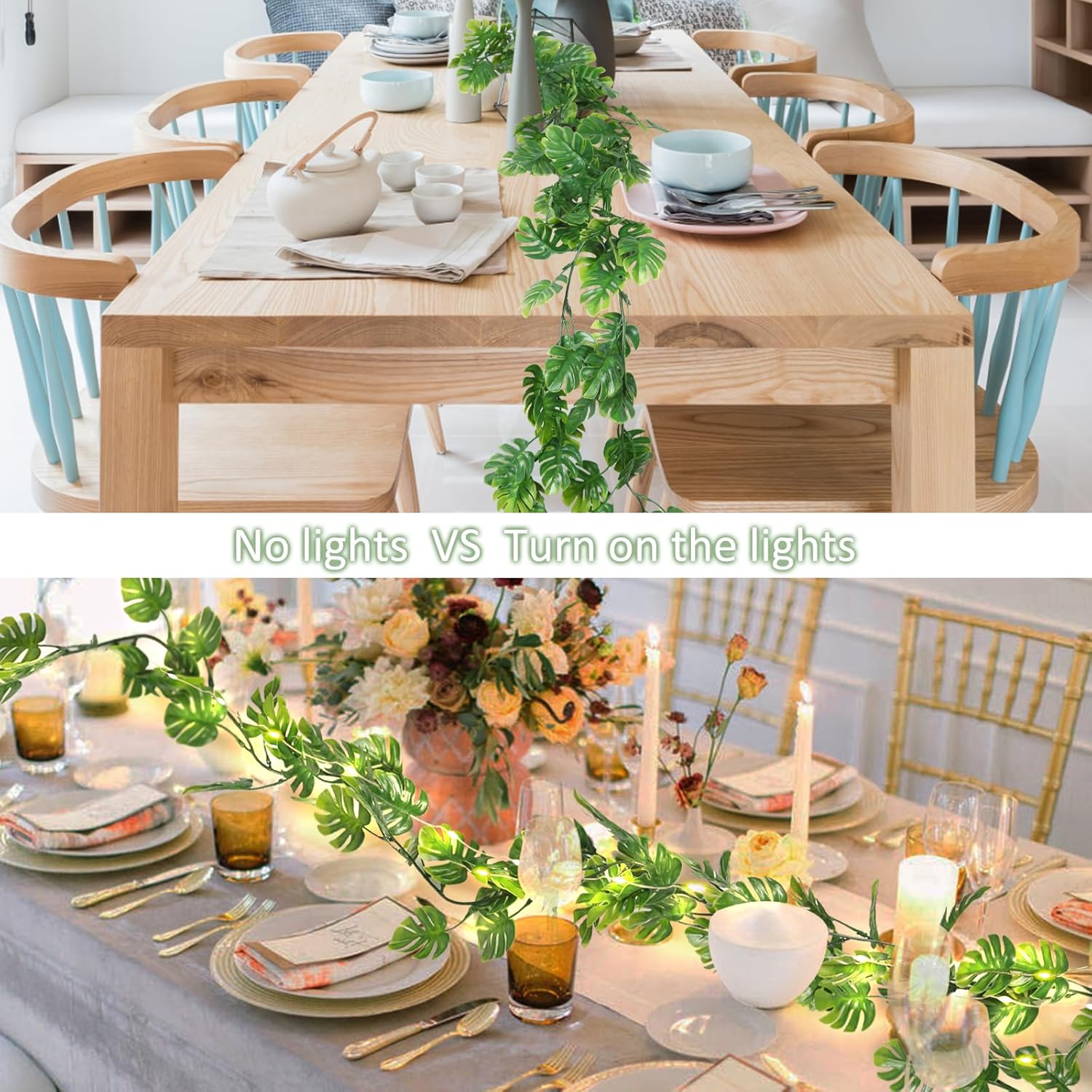 RECUTMS Artificial Monstera Leaf Vines Whit Light 2Pcs, 5.9FT Fake Hanging Ivy Plant Faux Tropical Palm Leaves Greenery Vine Garland Indoor Outdoor Garden Porch Patio Jungle Luau Birthday Party Décor