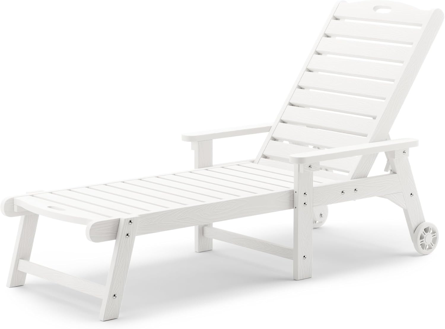 LUE BONA Outdoor Chaise Lounge, 79'' Oversized HDPS Chaise Lounger, 5 Positions Adjustable Lounge Chairs, Pool Lounge Chair with Wheels for Poolside, Backyard, 3 Year Warranty, White