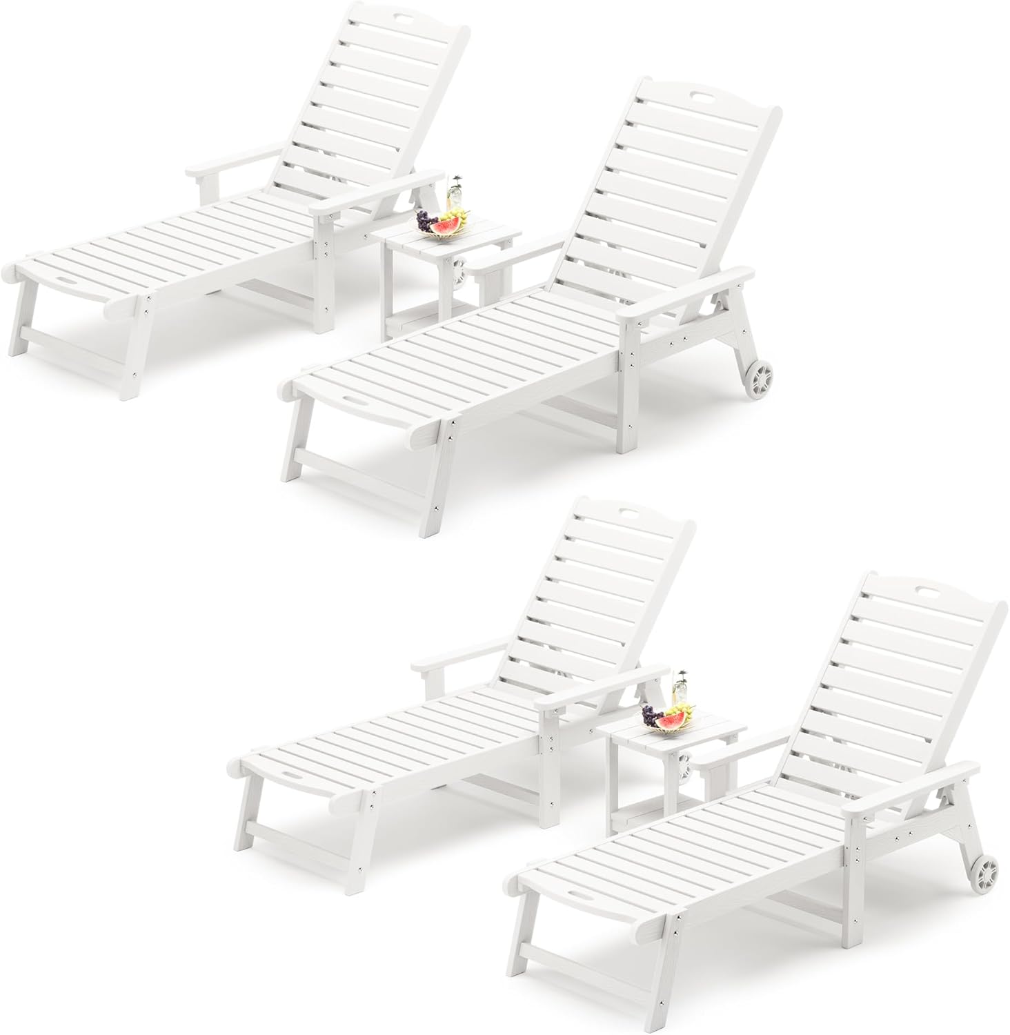 LUE BONA Chaise Lounge Chairs Set with Table, 6-Piece, 79'' Oversized HDPS Chaise Lounger, 5 Positions Adjustable Lounge Chairs, Pool Lounge Chair with Wheels for Poolside, 3 Year Warranty, White