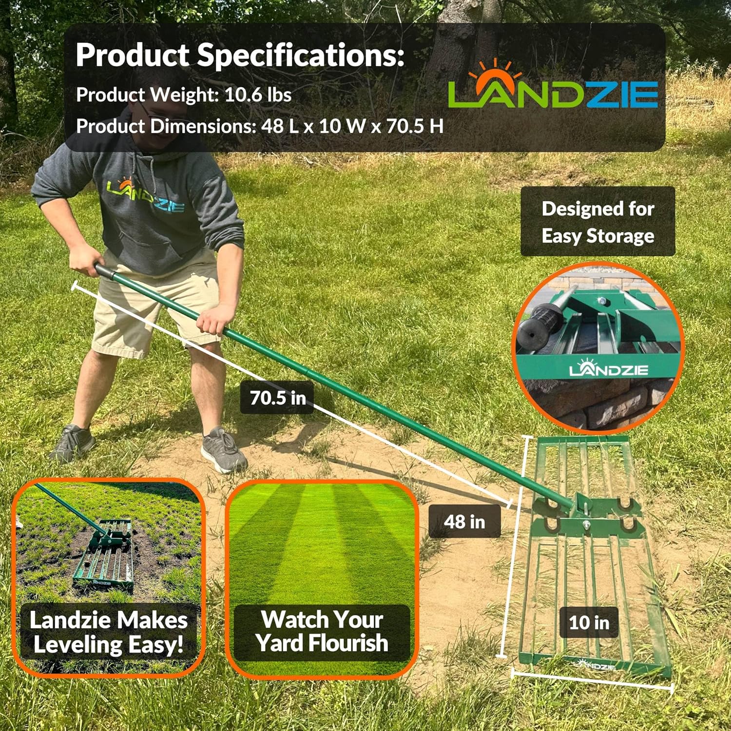 - QUICKLY GET THE JOB DONE: With leveling heads that come in different sizes ranging from 24 inches to as wide as 48 inches, the Landzie Lawn Level Rakes are designed to help you achieve a level and healthy lawn. The extended, 72-inch long handle is designed for maneuverability, easy storage, and comfortable handling of the equipment. USE WITH the Landzie Spreader (B07ZQSV81S) and the Landzie Fork Aerator (B09GCTKWS3) for a lush and level lawn this season.