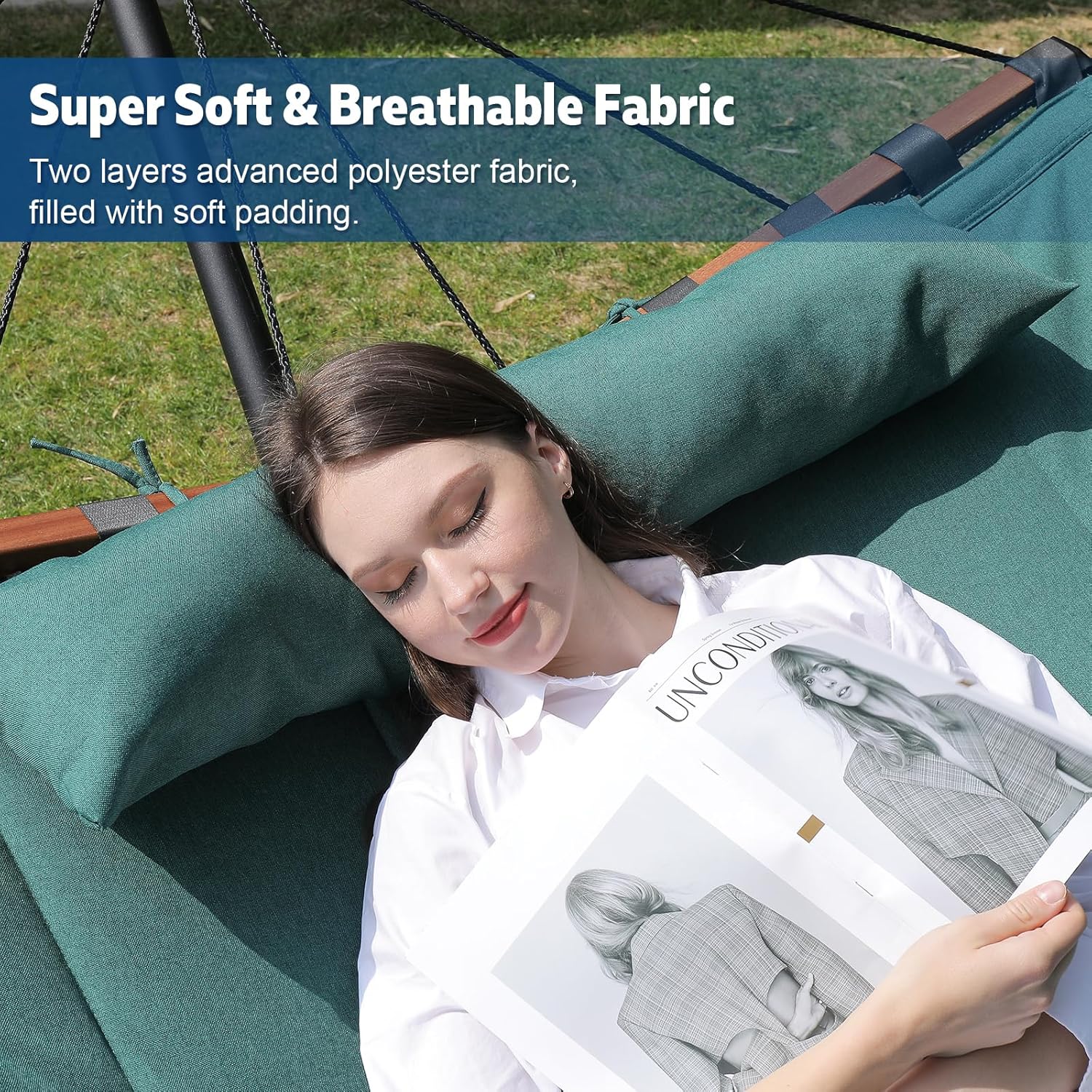 - â Premium Weather-Resistant Polyester Fabric: Two-layer quilted fabric hammock, filled with soft padding. Resting on our hammock for a moment feel like laying on the cloud. After strict selection, we use a kind of premium polyester fabric for our hammock which has better color fastness and brings you more comfortable feeling.