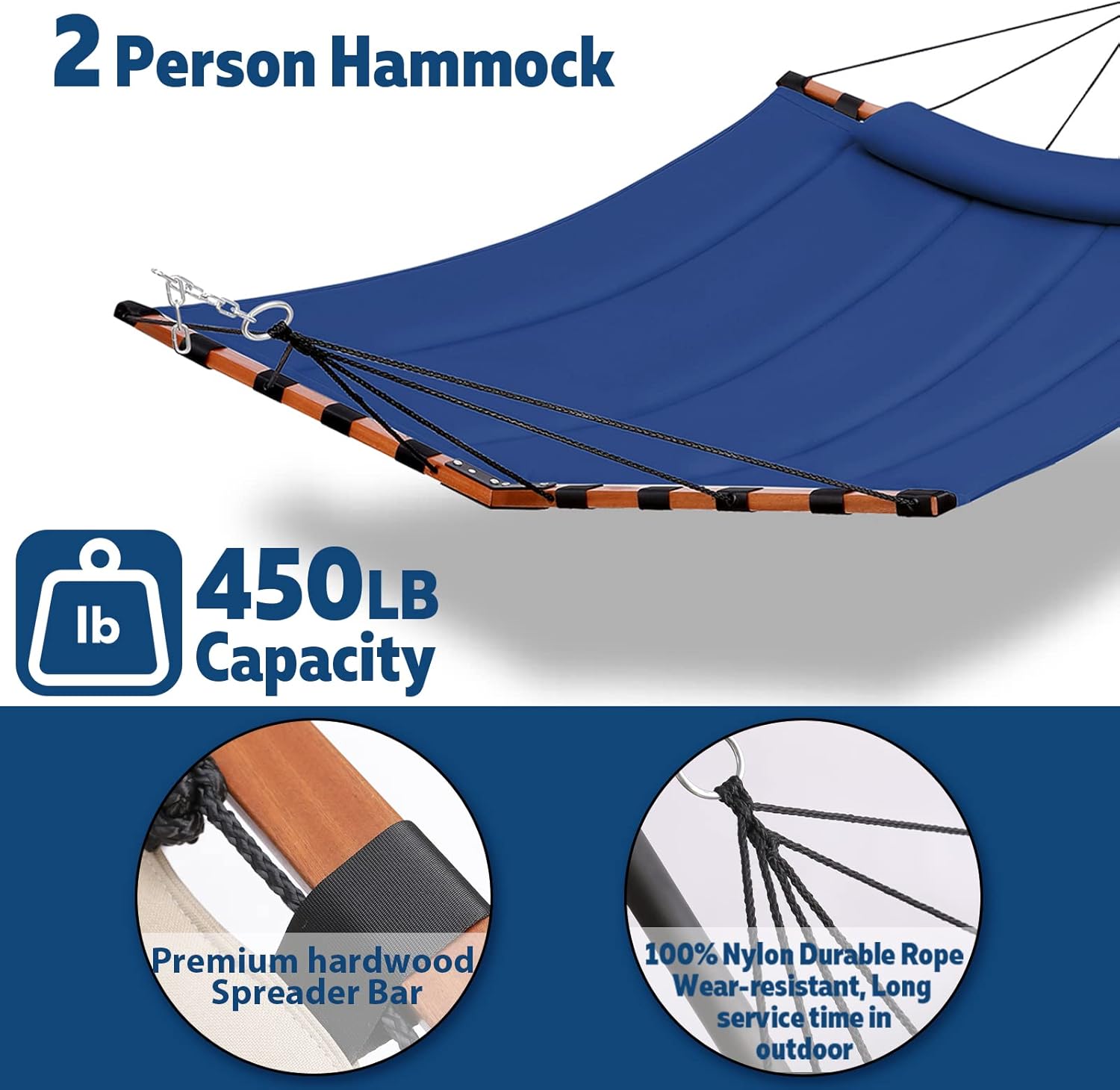 TegerDeger 12FT 2 Person Hammock Large Hammock 450LB Capacity with V Shaped Hardwood Spreader Bar & Nylon Rope for Outside, Patio, Garden, Backyard, Beach, Poolside - Blue